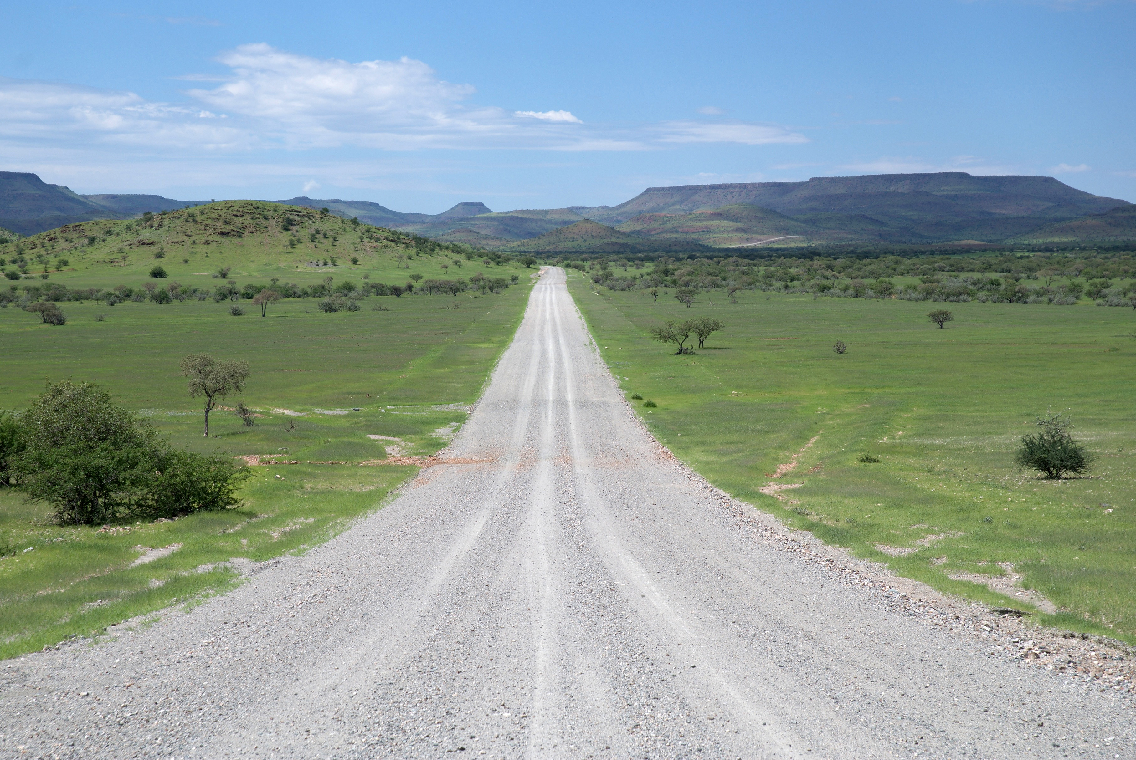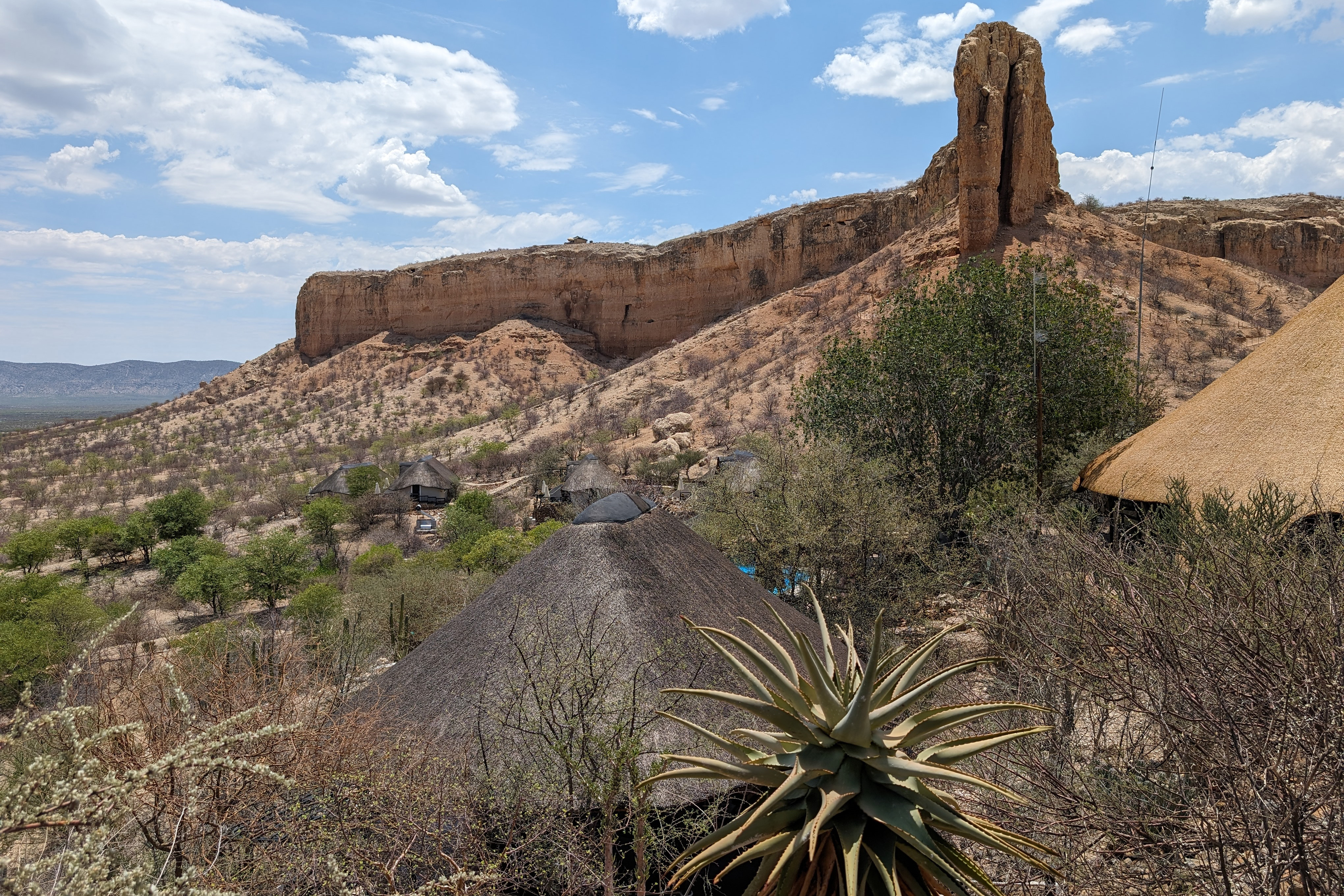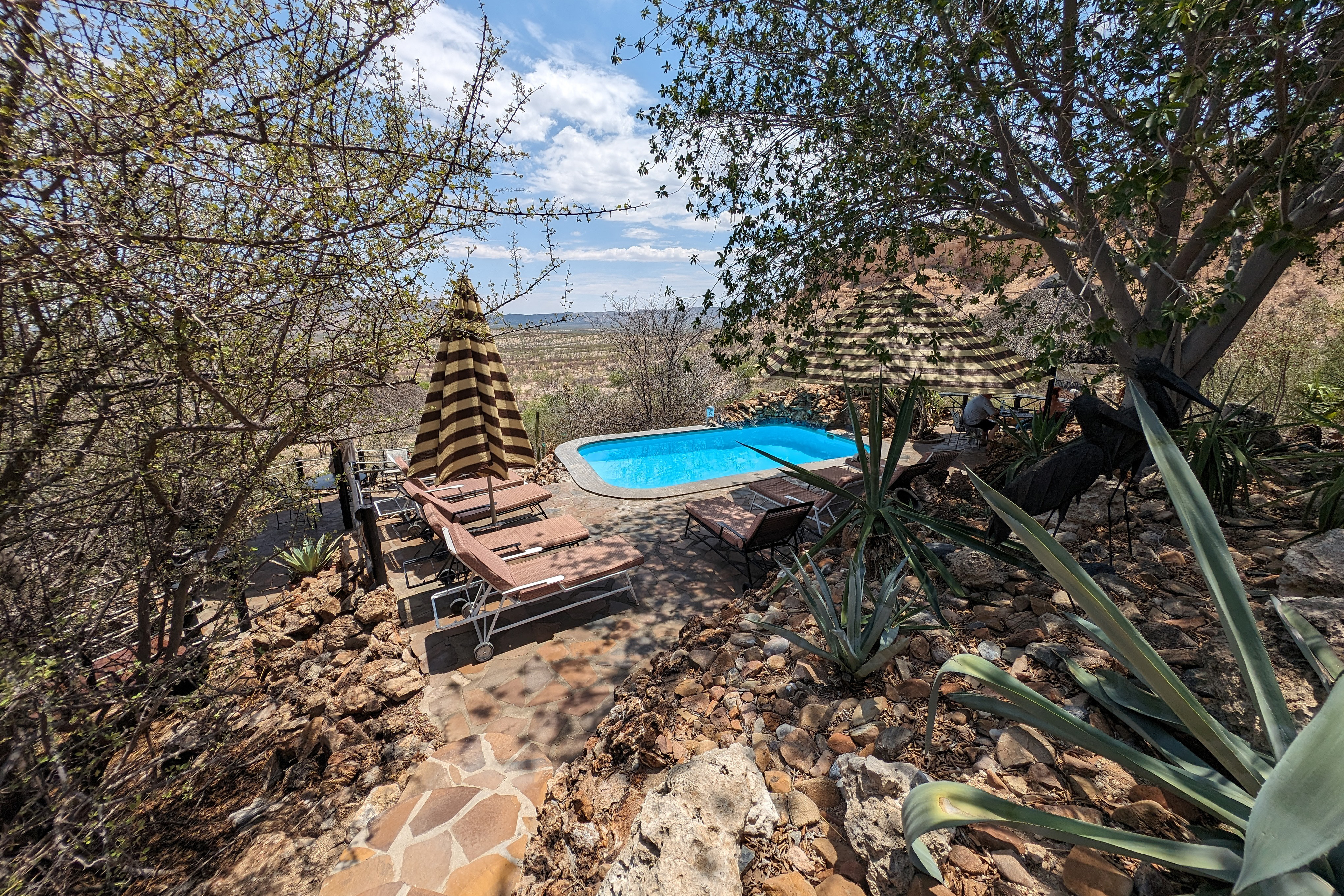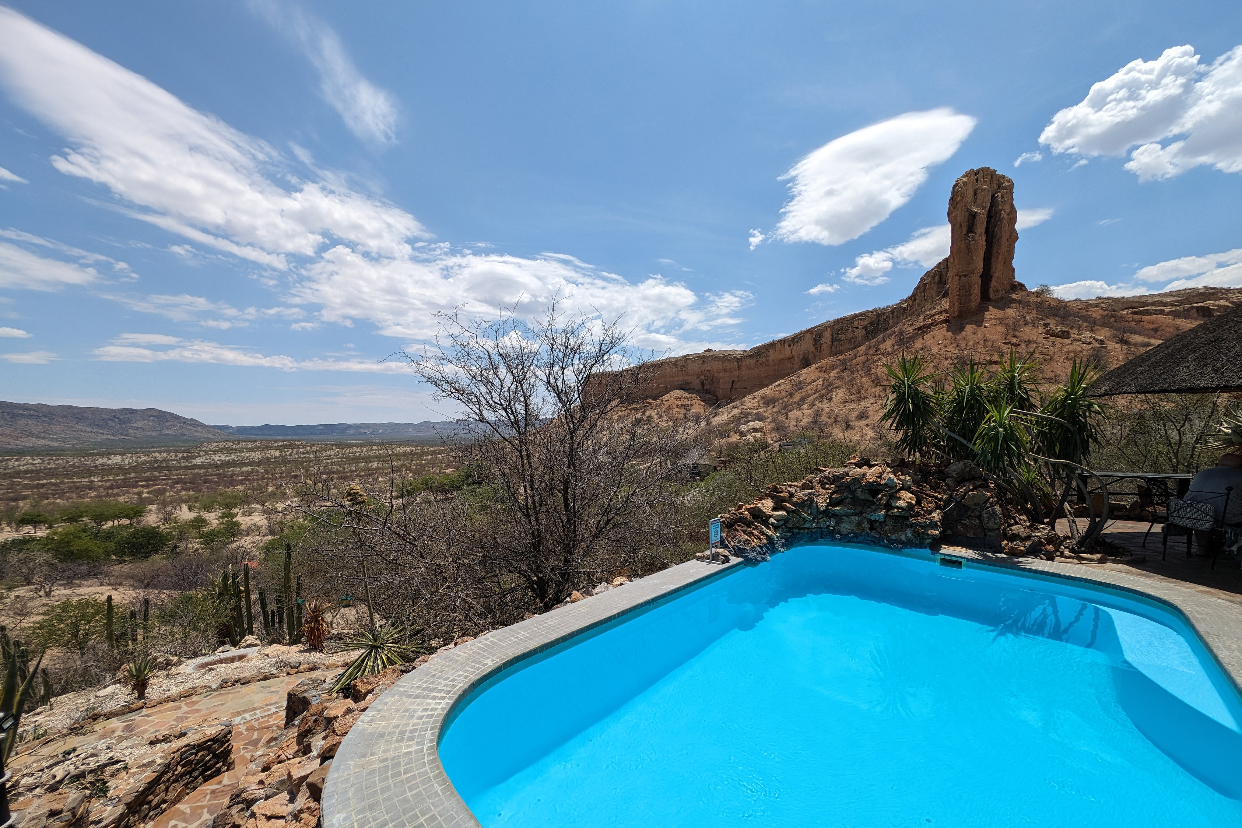 Nun verlassen wir wieder Sesfontein und fahren nach Südwesten zur Vingerklip Lodge. Am Morgen können wir noch einen Abstecher ins weite Hoanib-Tal machen. Im Hoanib-Tal leben viele Wildtiere wie Antilopen, Giraffen, Elefanten und selbst Löwen. Es ist ein imposanter Trockenfluss, der sich als grüne Ader bis zur Skelettküste durchzieht. Kurz hinter Palmwag biegen wir links ab und fahren den steilen Grootberg-Pass hinauf. Dort gibt es schöne Aussichtspunkte, von denen man die typische Landschaft des Damaralands mit seinen Tafelbergen sieht. Der Verbindungsetappe zwischen Sesfontein und Vingerklip Lodge ist mit fünf Stunden Fahrtzeit recht lang. Dafür sehen Sie aber auch viele verschiedene Habitattypen des Damaralands. Wir werden dann am Nachmittag die wunderschön gelegene Vingerklip Lodge erreichen. Hier können Sie ausgiebig entspannen. Die Lodge bietet einen schönen Pool und viele unterschiedliche Orte zum Relaxen. Man kann sich dort im Schatten seinen Lieblingsplatz aussuchen und ungestört entspannen. Auch ein Wasserloch ist in der Nähe, das Springböcke, Kudus, Zebras und andere Tierarten anzieht. Hier lässt sich mit dem Fernglas oder Spektiv das Wild ausgiebig beobachten. Zum Sonnenuntergang bietet sich auf jeden Fall eine kleine Wanderung auf das Plateau hinter der Lodge an. Von hier ist der Ausblick über die weite Landschaft am beeindruckendsten. In der Ferne sieht man dann auch sehr gut die Fingerklippe. Sie ist der vielleicht berühmteste Felsen Namibias. Der 35 m hohe Fels ist ein Erosionsrest, der mit seiner markanten Form einzigartig ist. Diesen Felsen können wir je nach Wunsch nach der Ankunft auf der Lodge besuchen oder am nächsten Morgen.