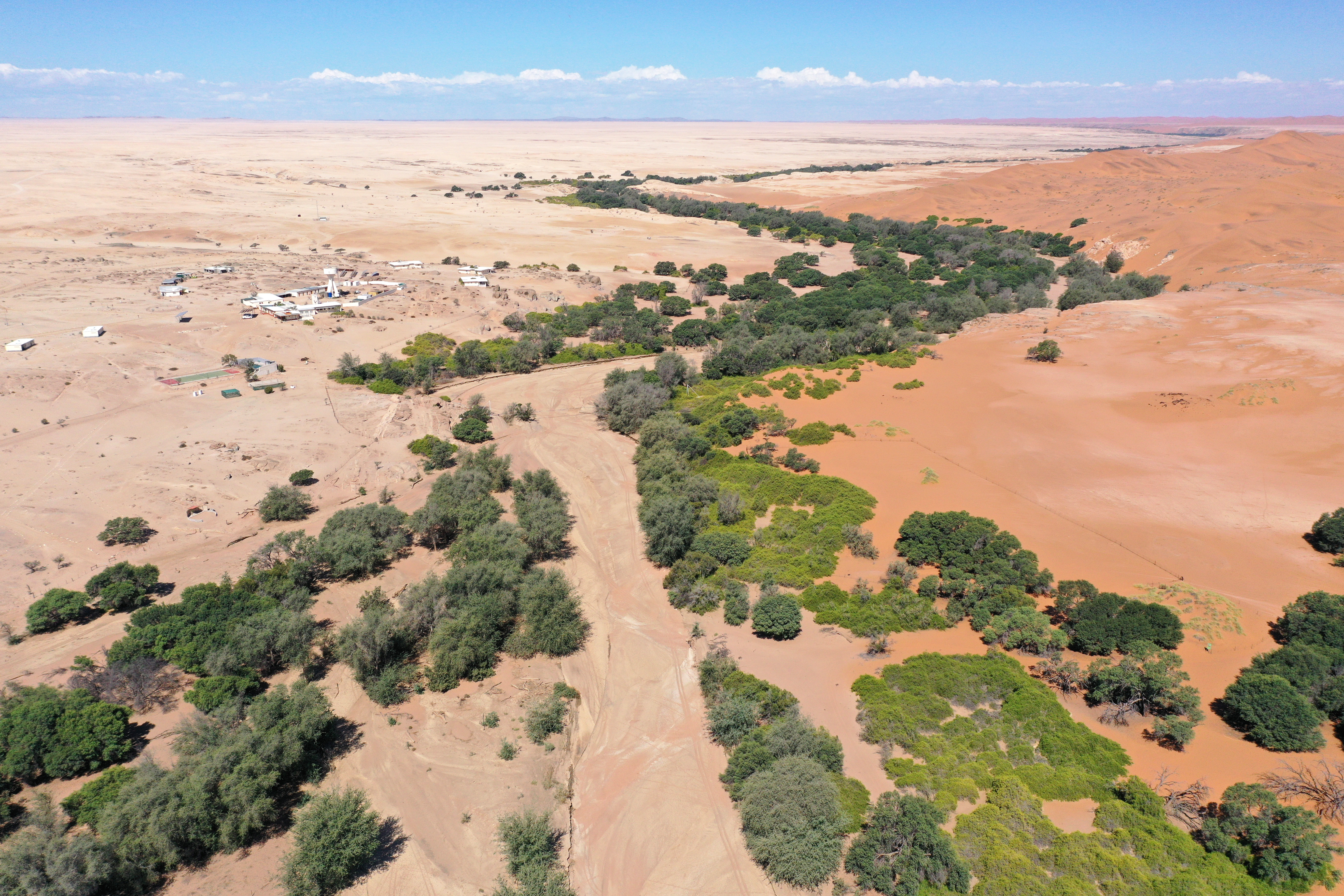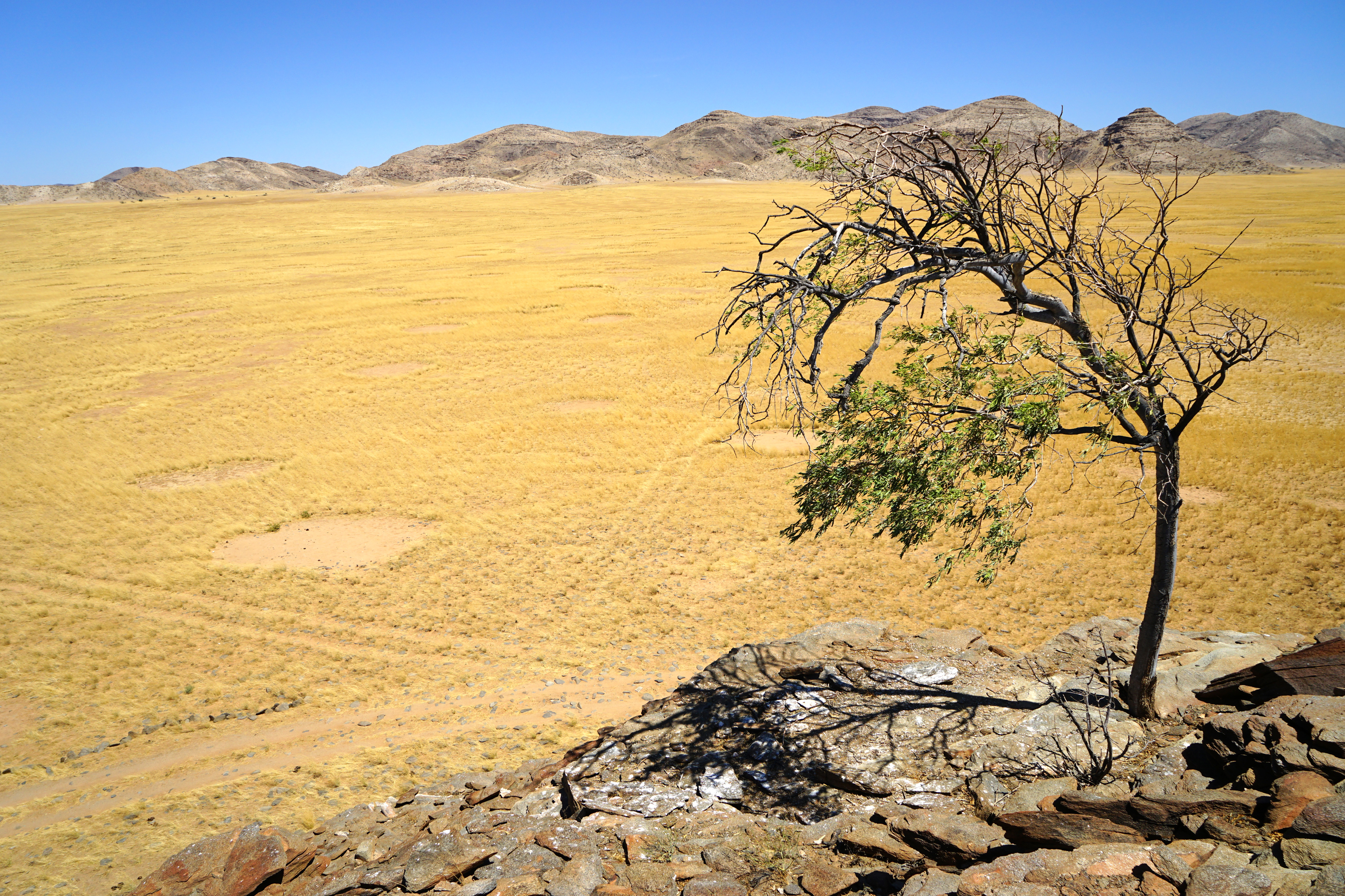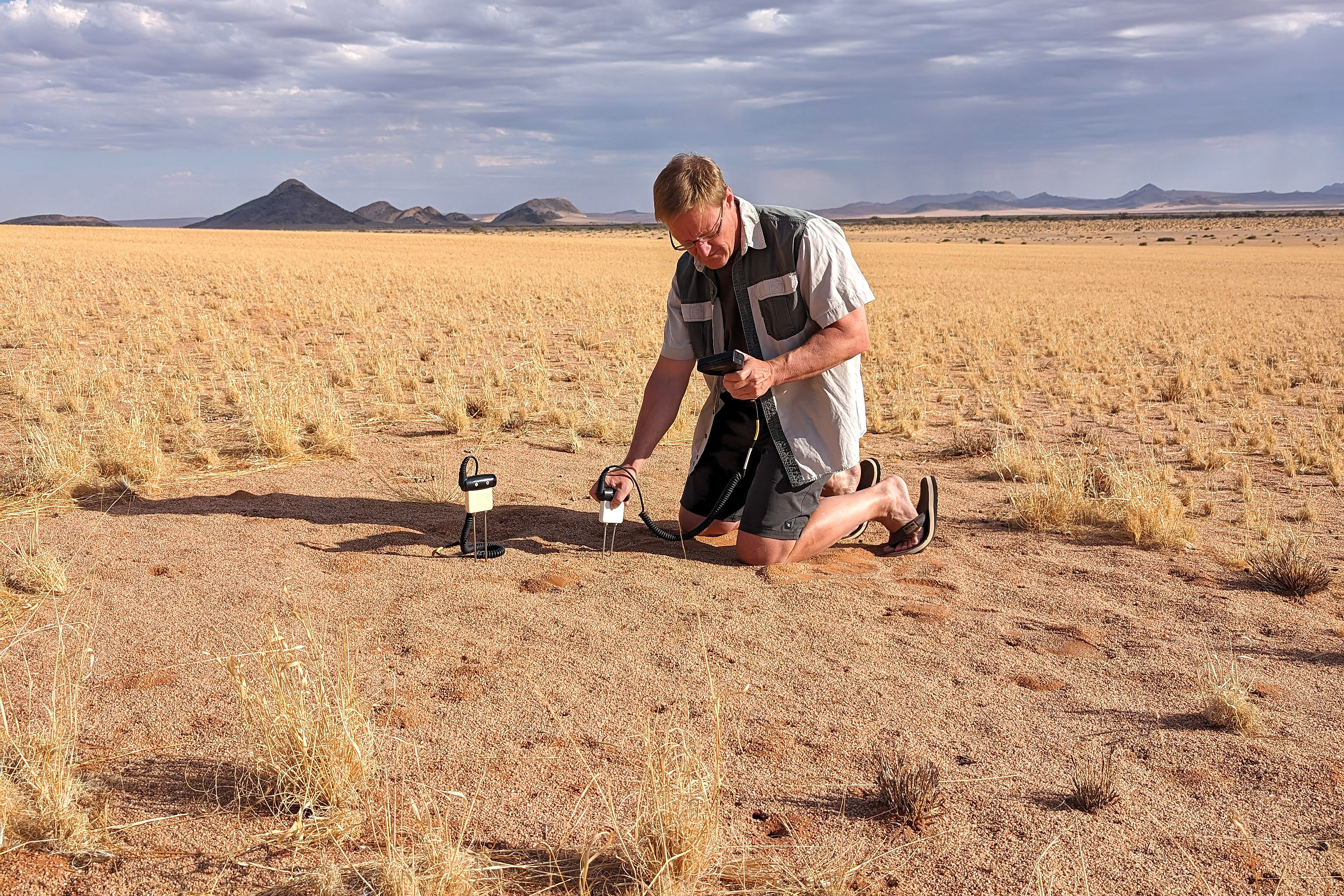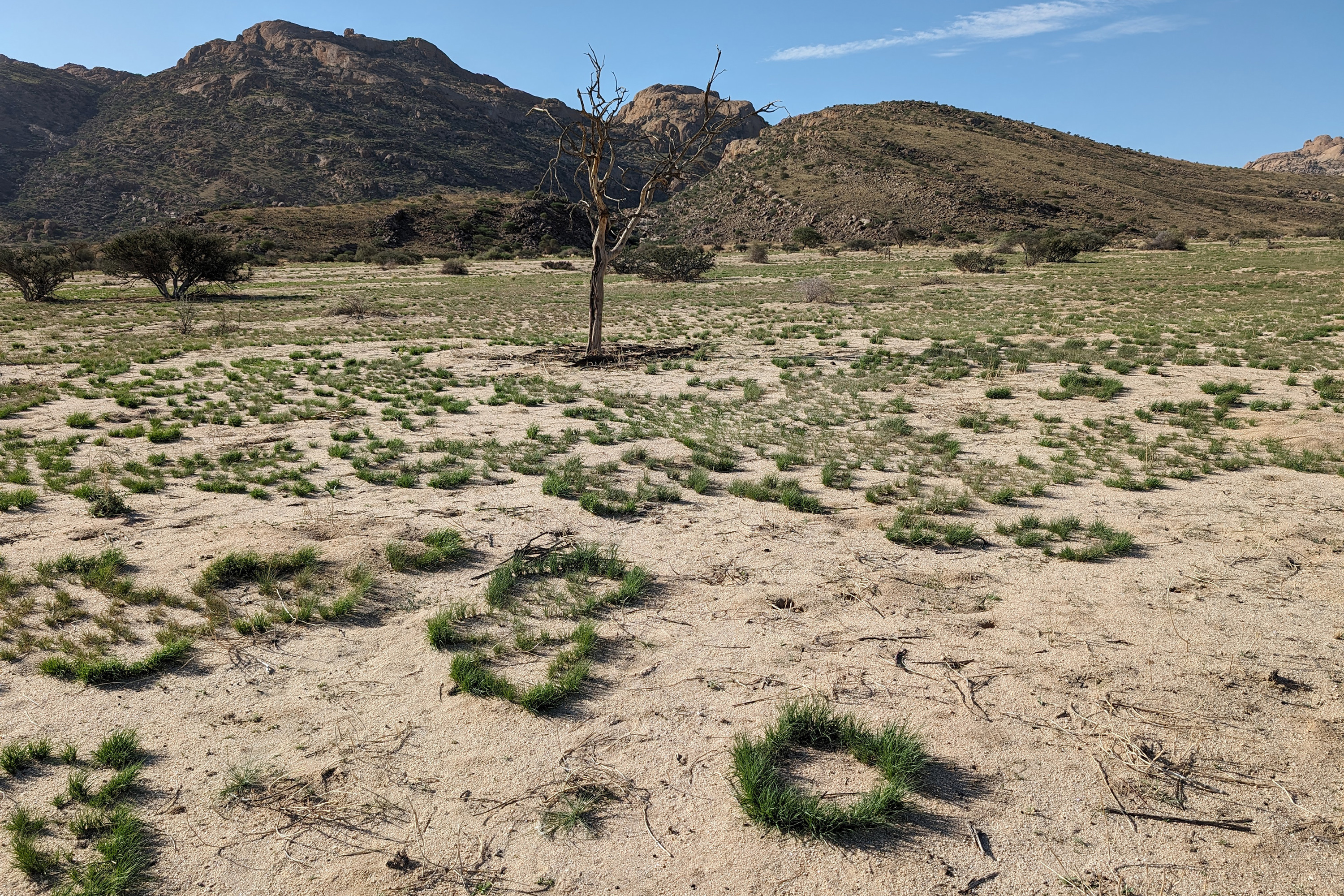 Das Gebiet am Eingang des Tsondab-Tals ist sehr trocken und der durchschnittliche jährliche Niederschlag beträgt weniger als 100 mm. Hier lassen sich die Pflanzen- und auch Tieranpassungen an Wassermangel gut beobachten. Schon morgens beim Frühstück werden Sie zahlreiche Vögel wie Siedelweber, Glanzstare, Trappen oder Felsentauben sehen, die sich alle um die nahe gelegene Wasserstelle sammeln. Auch Gnus und Oryx-Antilopen lassen sich gerne an den Wasserlöchern blicken. Auf einer Fahrt durch die Umgebung werden wir besondere Pflanzenringe der Grasart Eragrostis nindensis sehen, die ich dort über mehrere Jahre vermessen habe. Dieses Gras wird auch als „Acht-Tage-Gras“ bezeichnet, weil es gut eine Woche nach dem Regen stark ergrünt. Das Gras bildet nur Ringe, wenn großer Wassermangel vorherrscht, denn wo es feuchter ist, wie im Landesinneren, dort bildet es geschlossene Grashorste. Diese Grasringe gehören zu mehr als einem Dutzend Pflanzenarten, die allesamt Ringe in der Namib bilden. Wir haben diese Pflanzenringe erstmalig 2020 kartiert. Die Ringe wurden trotz ihrer großen Vielfalt noch nie beschrieben. Ich habe deshalb diese Pflanzenringe der Namib in einem mehrjährigen Forschungsprojekt speziell untersucht. Die Forschungsergebnisse zu den auf der Namib Naukluft Lodge und in 40 weiteren Gebieten untersuchten Grasringen sind seit Dezember 2025 als Publikation mit dem Titel Ring-formation in a Namibian resurrection grass and its relation to climate, neighborhood competition and soil microbes online verfügbar. Auf unserer Forscher-Tour können wir uns die Ringe genauer ansehen, denn häufig sind in der Wüste auch kleine unscheinbare Anpassungen besonders interessant. Am Nachmittag können wir dann nach Westen fahren, wo wir auch Feenkreise sehen werden. Diese Feenkreise dort sind ebenso wie die kleineren Pflanzenringe kreisrund, denn die Gräser saugen das innere Bodenwasser heraus. Hierzu habe ich auch Messungen vor Ort gemacht. Die kreisrunde Form ist eine spezielle Anpassung der Gräser an Wassermangel, der in dieser region der Namib permamenent vorherrscht. Danach geht es weiter zu einem „Wald“ aus Moringa-Bäumen. Solch große Ansammlungen von Moringa-Bäumen sind in Namibia etwas sehr Besonderes. Diesen Moringa-Wald habe ich mit Drohnen kartiert, um herauszufinden, inwieweit die Bäume von den Linien der umgebenden Trockenflüsse abhängig sind. Wenn es mal in der Wüste regnet, dann können kleine Senken lebenswichtiges Wasser ansammeln und damit die Verteilung der Vegetation stark beeinflussen. Manche Baumarten sind deshalb stärker vom Flussbett abhängig, manche weniger, weil sie zum Beispiel besonders tiefe Wurzeln haben oder weil sie viel Wasser im dicken Stamm speichern können, so wie es die Moringa-Bäume tun. Nachdem wir diesen Wald angeschaut haben, können wir den Tag mit einem besonders schönen Sonnenuntergang ausklingen lassen. Krönender Abschluss des Tages ist dann wieder das Dinner unter freiem Sternenhimmel.