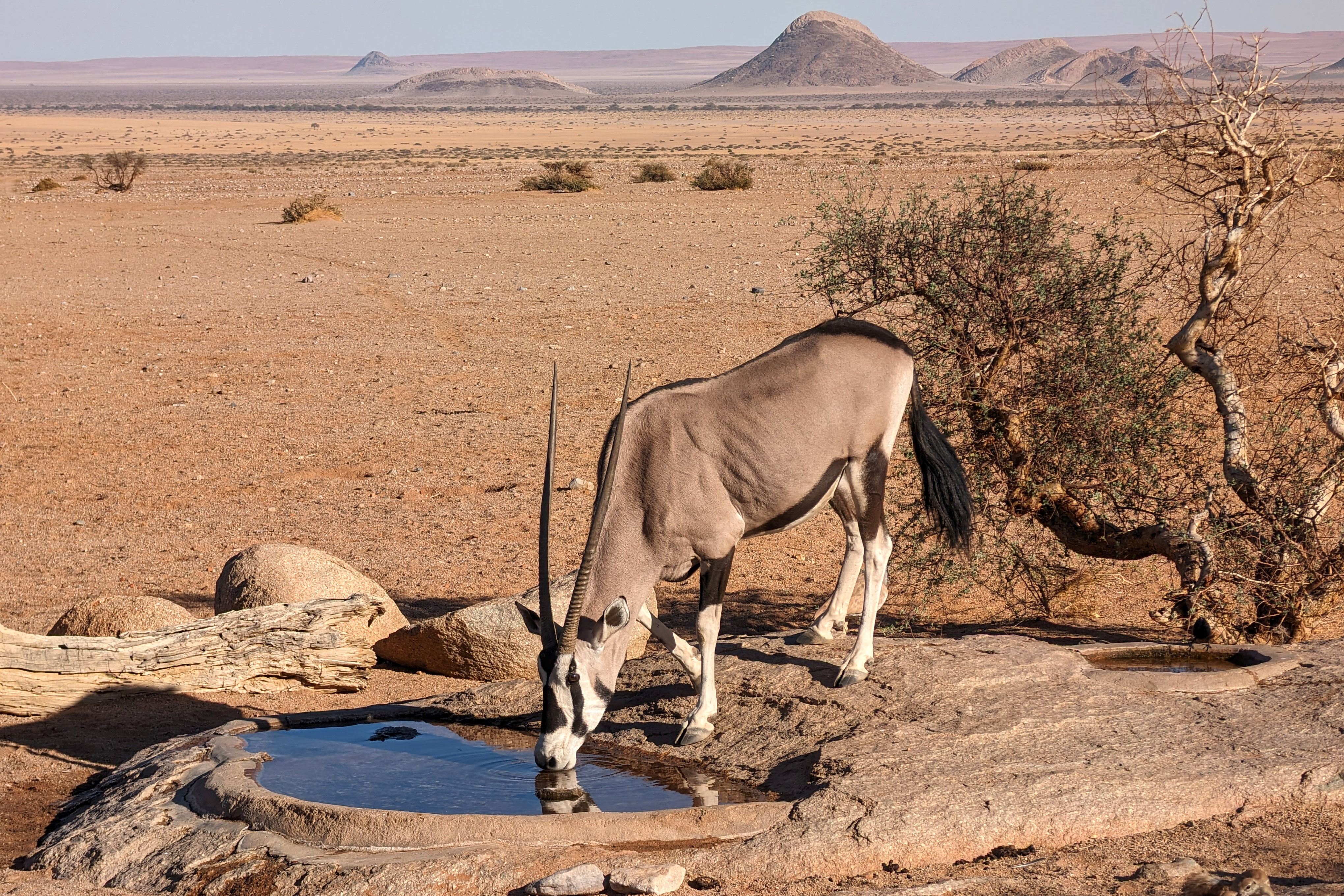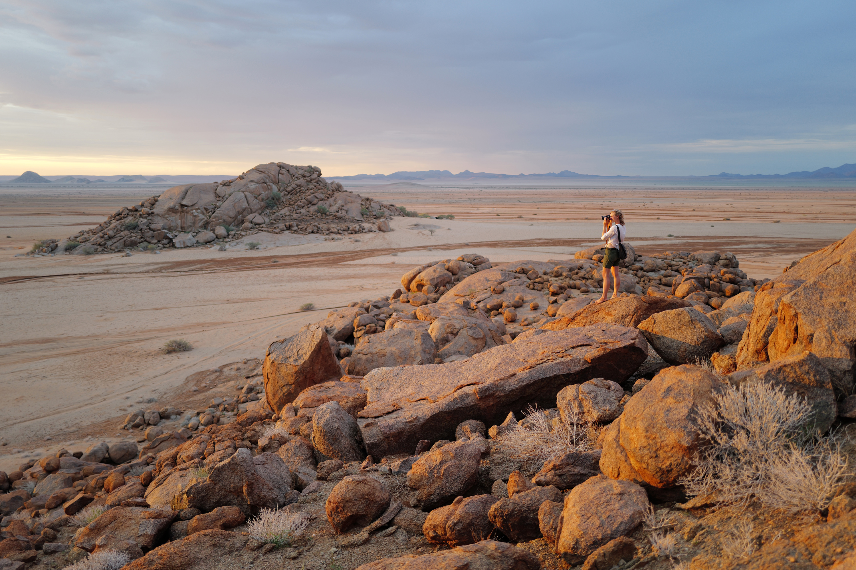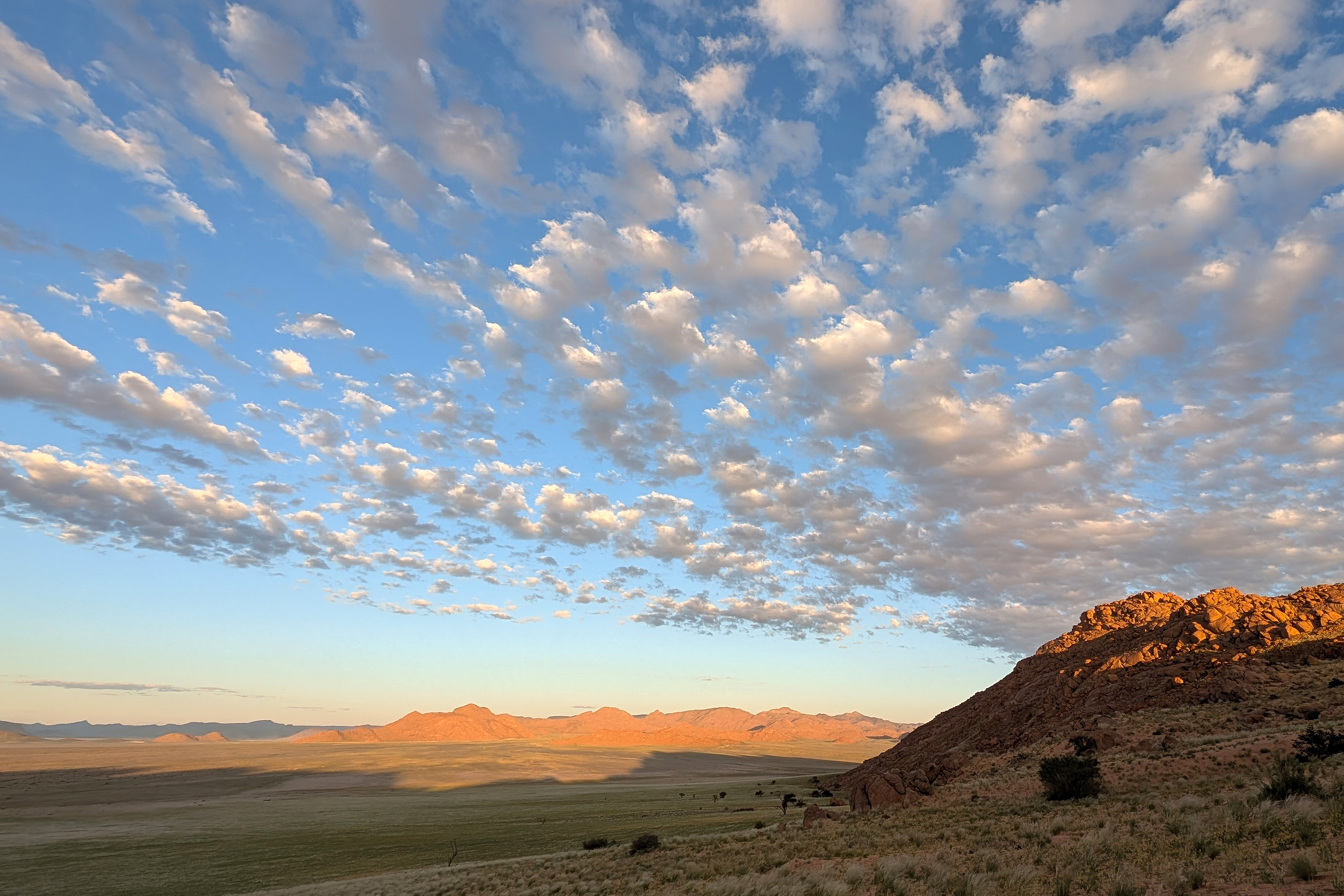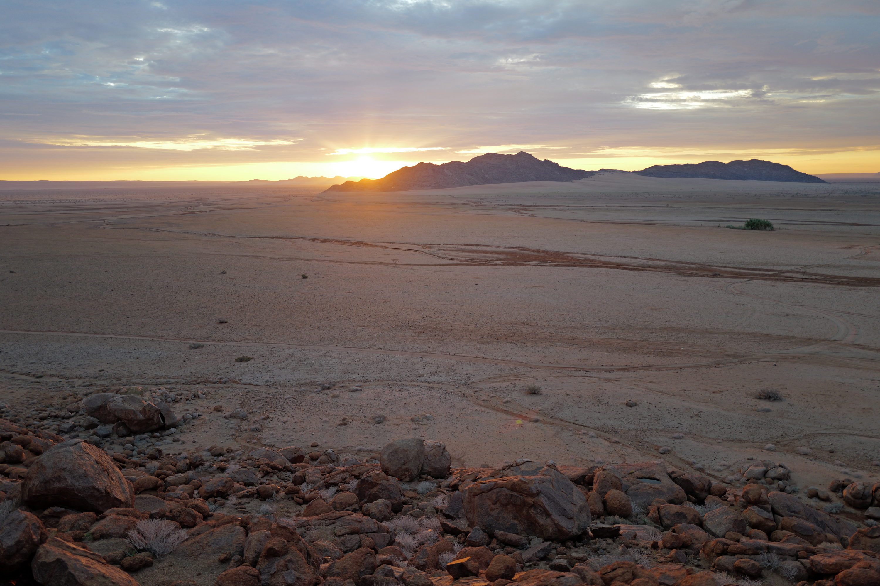 Am Vormittag fahren wir in den nahe gelegenen Daan Viljoen Game Park, der viele Wildtiere wie Giraffen, Gnus, Oryx, Springböcke, Zebras, Kudus, Paviane oder Warzenschweine hat. Er ist Teil der Hochland-Savanne und befindet sich auf 1600 m bis 1800 m Höhe über dem Meeresspiegel. Der durchschnittliche jährliche Niederschlag beträgt um die 350 mm, sodass viele verschiedene Grasarten im Park wachsen. Ich hatte dort 1999 Hunderte von Gräsern aus 26 verschiedenen Arten in Abhängigkeit vom Abstand zu Wasserstellen kartiert. Die Grasartenkomposition verändert sich nämlich stark mit zunehmenden Weidedruck nahe der Wasserstellen. Man kann somit über die Grasarten genau messen, wie stark oder fortgeschritten die Überweidung ist. Gerne berichte ich von dieser Studie, wenn wir durch den Park laufen. Zum genauen Nachlesen ist die Studie auch onlinepubliziert. Anschließend verlassen wir das zentrale Khomas-Hochland und fahren nach Westen zur Großen Randstufe, wo sich unterhalb die Namib befindet. Da Namibia seinen Regen durch feuchte Luftmassen aus dem Nordosten bezieht, ist eine Reise zur westlich gelegenen Namib immer auch ein zunehmendes Eintauchen in die trockene Wüste. Sie werden somit im Laufe der Tagestour sehen, wie die Baumhöhen und die Vegetation allgemein abnehmen. Die Bäume bevorzugen tiefes Bodenwasser, wohingegen die Gräser mehr oberhalb im Boden das Wasser aufnehmen. Diese Aufteilung der Ressourcen ermöglicht letztlich erst die Existenz von Savannen – eine Erklärungsidee, die auf den deutschen Ökologen Heinrich Walter und die 1930er Jahre zurückgeht. 2013 fassten wir diese Erklärung des Savannen-Phänomens in einem großen Überblicksartikel zusammen. Wenn wir die Große Randstufe erreicht haben, werden wir an einem der spektakulärsten Pässe Namibias – dem Spreetshoogte-Pass – die Aussicht genießen. Von dort schaut man Hunderte Meter bergab in die Namib. Von da an geht es nur noch bergab und wir werden bald die Namib-Naukluft Lodge am Eingang des Tsondab-Tals erreichen, wo wir zwei Nächte bleiben werden. In unmittelbarer Nähe zur Lodge gibt es einen kleinen Granithügel, der sehr viele und gut erhaltene Buschmannzeichnungen hat. Diese Felsmalereien sind sehr filigran und mindestens 500 Jahre alt. Von diesem Hügel kann man am Abend herrlich den Sonnenuntergang genießen. Auch direkt hinter der Lodge am Swimmingpool kann man entlang der Felskuppen gehen und sich einen schönen Platz suchen. Der Sonnenuntergang im Tsondab-Tal ist von jedem Aussichtspunkt ein Augenschmaus.