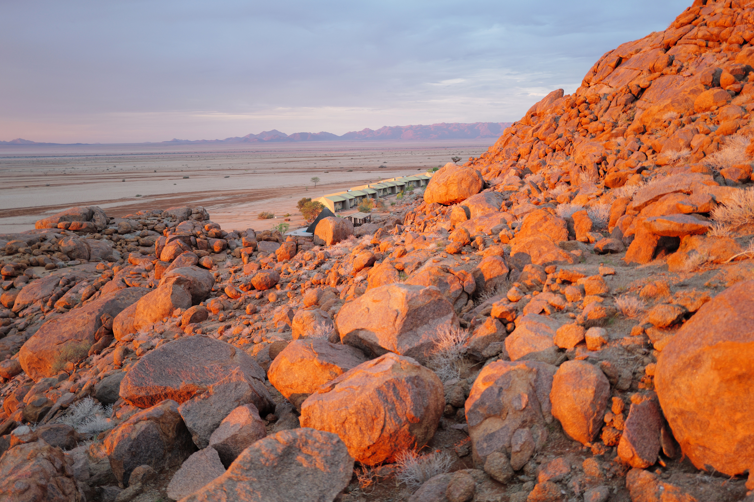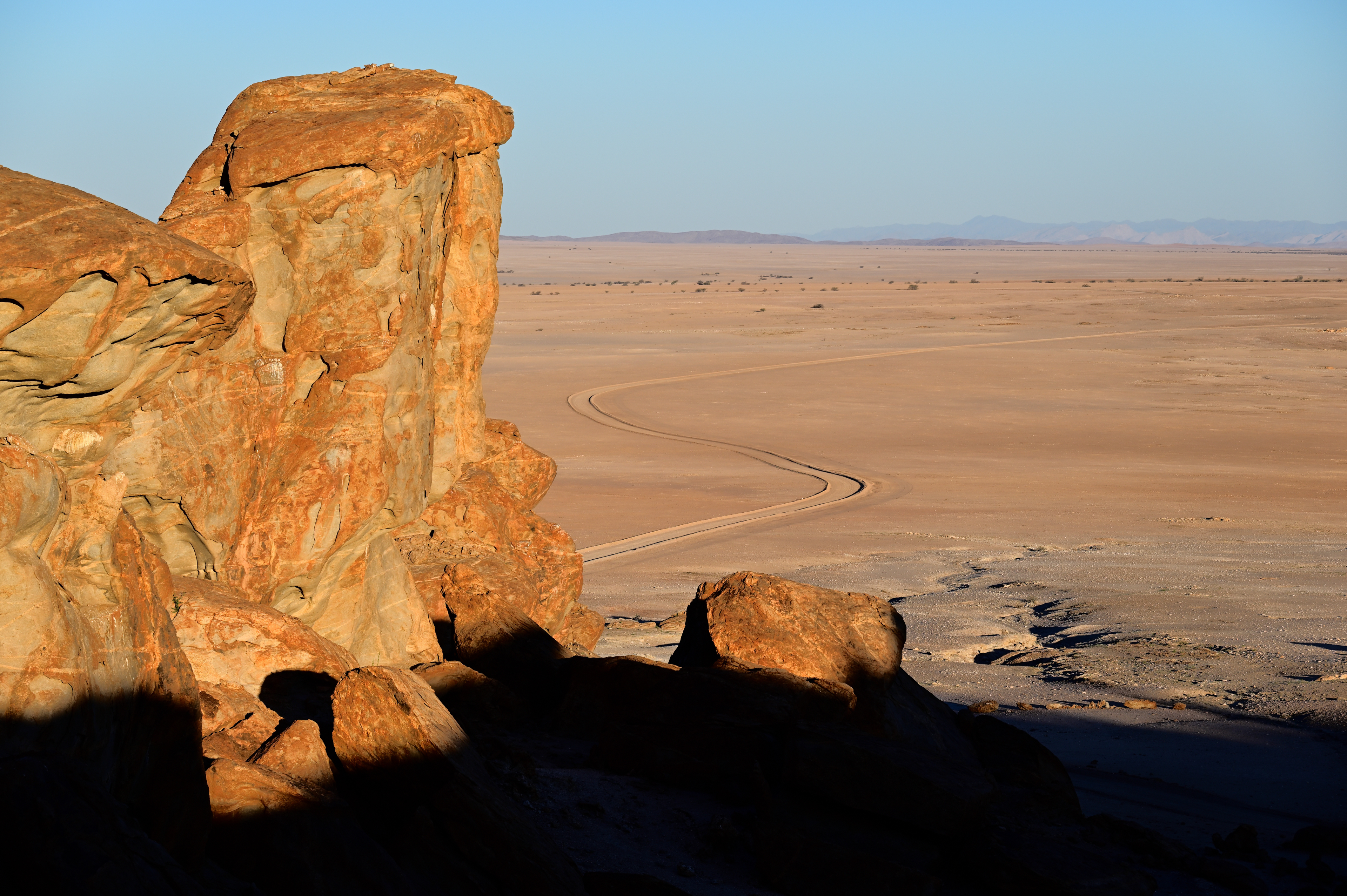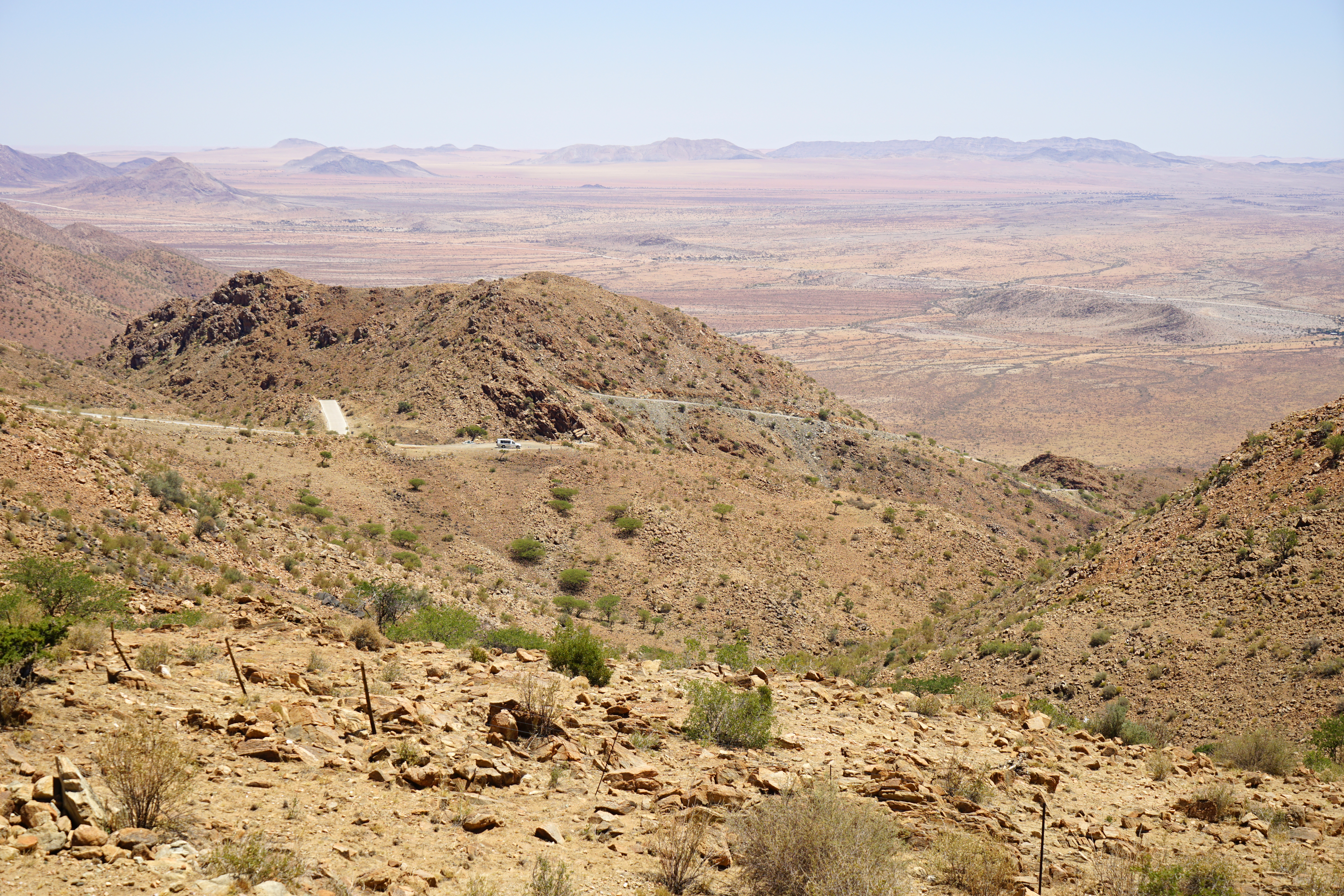 Am Vormittag fahren wir in den nahe gelegenen Daan Viljoen Game Park, der viele Wildtiere wie Giraffen, Gnus, Oryx, Springböcke, Zebras, Kudus, Paviane oder Warzenschweine hat. Er ist Teil der Hochland-Savanne und befindet sich auf 1600 m bis 1800 m Höhe über dem Meeresspiegel. Der durchschnittliche jährliche Niederschlag beträgt um die 350 mm, sodass viele verschiedene Grasarten im Park wachsen. Ich hatte dort 1999 Hunderte von Gräsern aus 26 verschiedenen Arten in Abhängigkeit vom Abstand zu Wasserstellen kartiert. Die Grasartenkomposition verändert sich nämlich stark mit zunehmenden Weidedruck nahe der Wasserstellen. Man kann somit über die Grasarten genau messen, wie stark oder fortgeschritten die Überweidung ist. Gerne berichte ich von dieser Studie, wenn wir durch den Park laufen. Zum genauen Nachlesen ist die Studie auch onlinepubliziert. Anschließend verlassen wir das zentrale Khomas-Hochland und fahren nach Westen zur Großen Randstufe, wo sich unterhalb die Namib befindet. Da Namibia seinen Regen durch feuchte Luftmassen aus dem Nordosten bezieht, ist eine Reise zur westlich gelegenen Namib immer auch ein zunehmendes Eintauchen in die trockene Wüste. Sie werden somit im Laufe der Tagestour sehen, wie die Baumhöhen und die Vegetation allgemein abnehmen. Die Bäume bevorzugen tiefes Bodenwasser, wohingegen die Gräser mehr oberhalb im Boden das Wasser aufnehmen. Diese Aufteilung der Ressourcen ermöglicht letztlich erst die Existenz von Savannen – eine Erklärungsidee, die auf den deutschen Ökologen Heinrich Walter und die 1930er Jahre zurückgeht. 2013 fassten wir diese Erklärung des Savannen-Phänomens in einem großen Überblicksartikel zusammen. Wenn wir die Große Randstufe erreicht haben, werden wir an einem der spektakulärsten Pässe Namibias – dem Spreetshoogte-Pass – die Aussicht genießen. Von dort schaut man Hunderte Meter bergab in die Namib. Von da an geht es nur noch bergab und wir werden bald die Namib-Naukluft Lodge am Eingang des Tsondab-Tals erreichen, wo wir zwei Nächte bleiben werden. In unmittelbarer Nähe zur Lodge gibt es einen kleinen Granithügel, der sehr viele und gut erhaltene Buschmannzeichnungen hat. Diese Felsmalereien sind sehr filigran und mindestens 500 Jahre alt. Von diesem Hügel kann man am Abend herrlich den Sonnenuntergang genießen. Auch direkt hinter der Lodge am Swimmingpool kann man entlang der Felskuppen gehen und sich einen schönen Platz suchen. Der Sonnenuntergang im Tsondab-Tal ist von jedem Aussichtspunkt ein Augenschmaus.