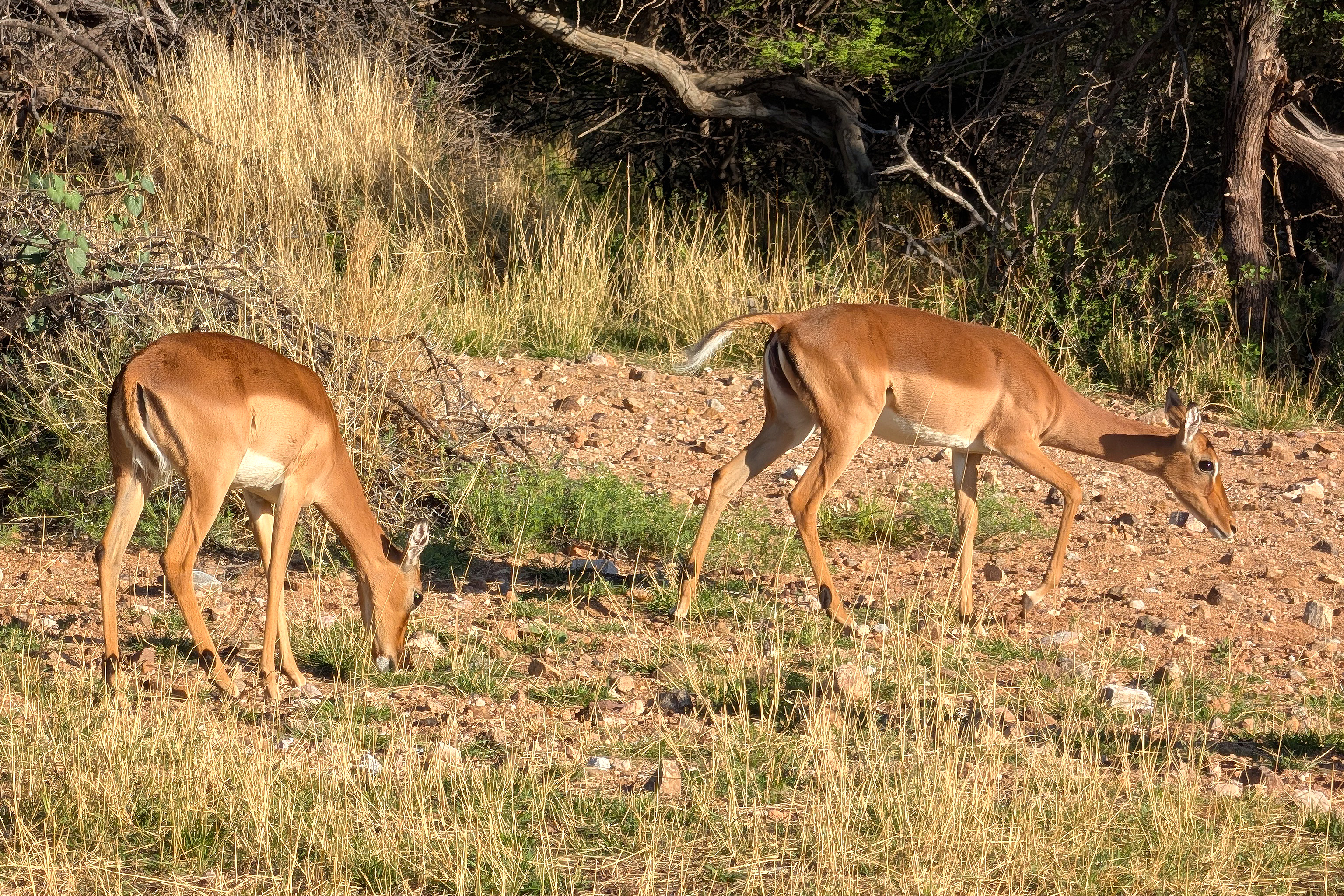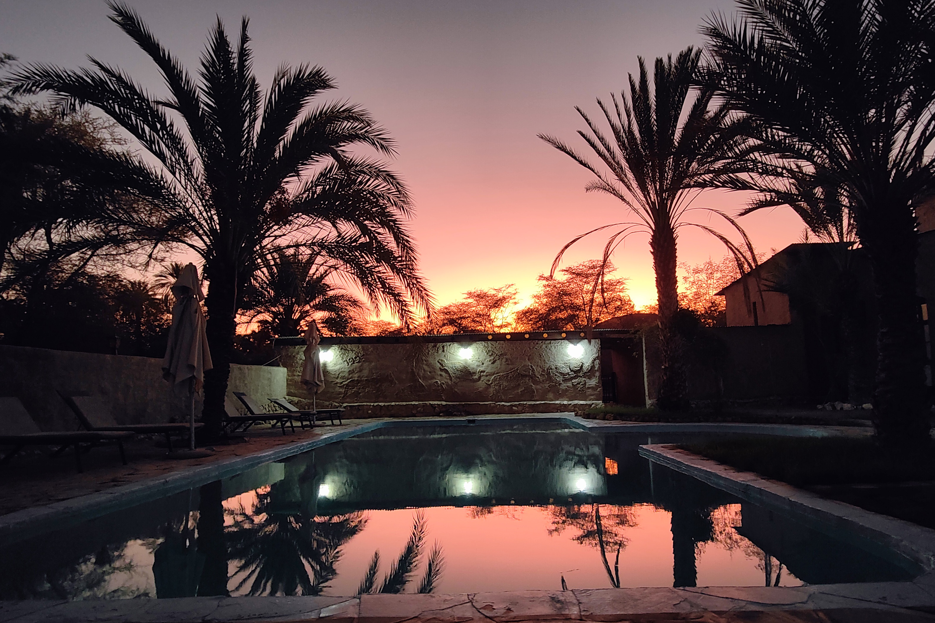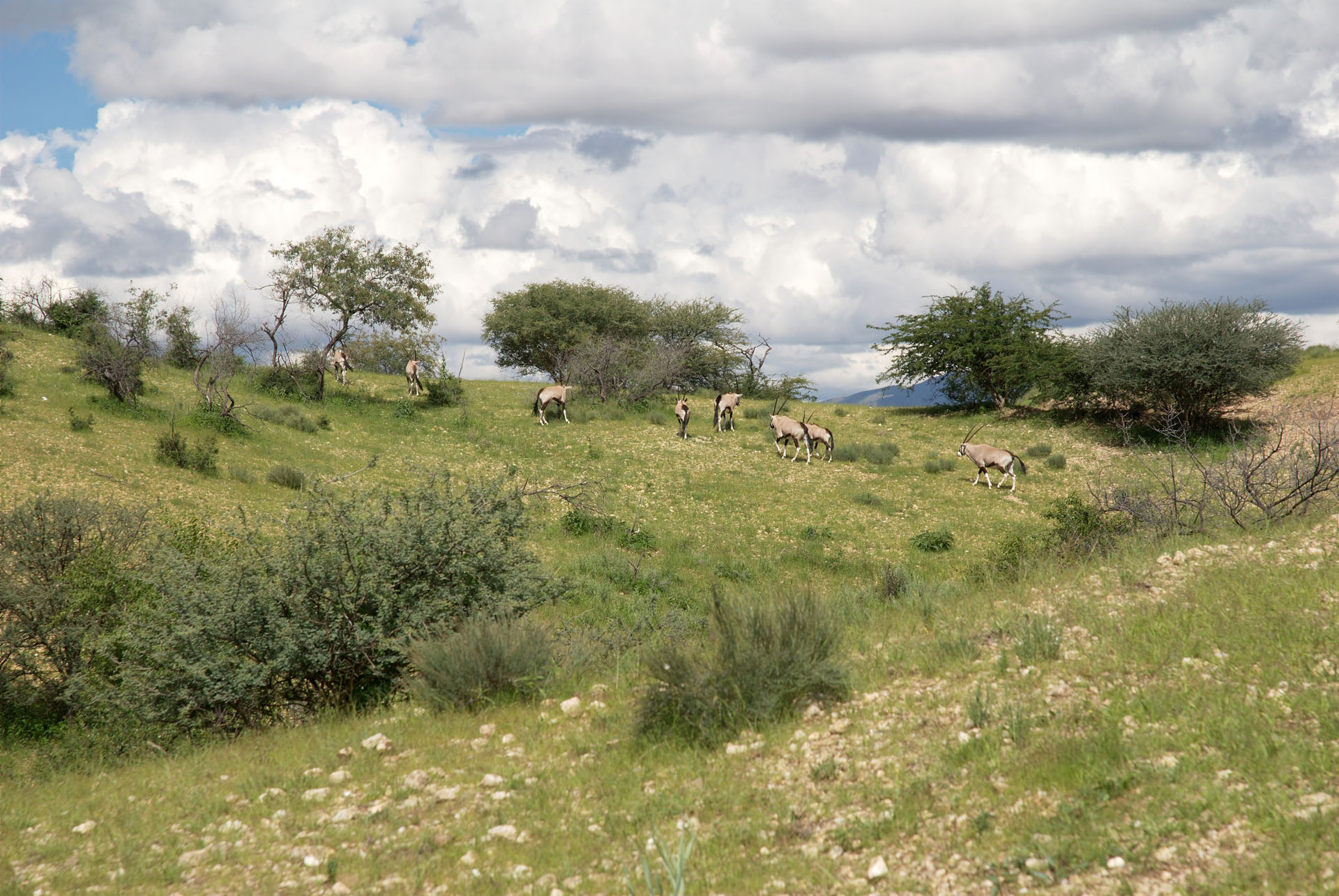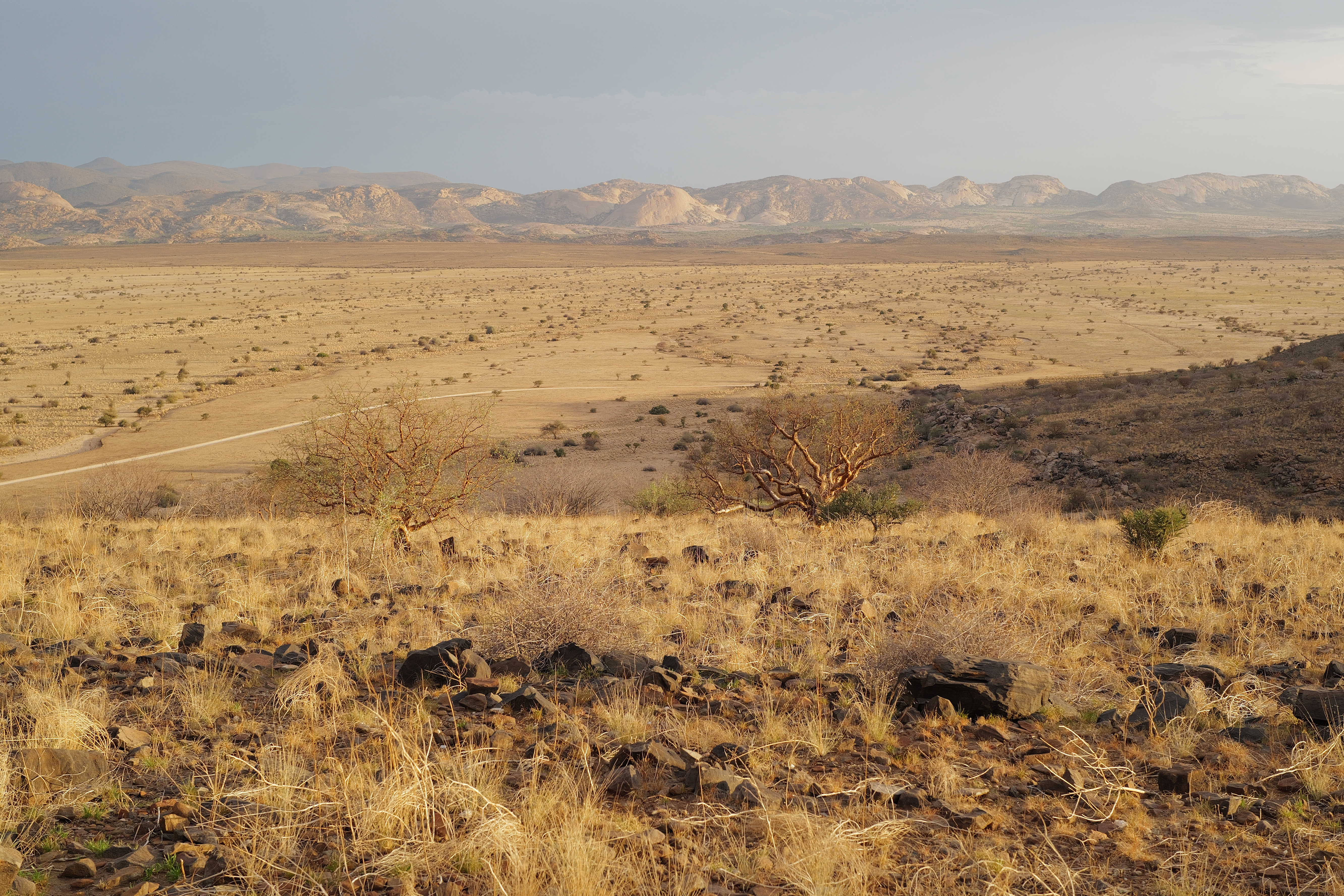 Am Vormittag fahren wir in den nahe gelegenen Daan Viljoen Game Park, der viele Wildtiere wie Giraffen, Gnus, Oryx, Springböcke, Zebras, Kudus, Paviane oder Warzenschweine hat. Er ist Teil der Hochland-Savanne und befindet sich auf 1600 m bis 1800 m Höhe über dem Meeresspiegel. Der durchschnittliche jährliche Niederschlag beträgt um die 350 mm, sodass viele verschiedene Grasarten im Park wachsen. Ich hatte dort 1999 Hunderte von Gräsern aus 26 verschiedenen Arten in Abhängigkeit vom Abstand zu Wasserstellen kartiert. Die Grasartenkomposition verändert sich nämlich stark mit zunehmenden Weidedruck nahe der Wasserstellen. Man kann somit über die Grasarten genau messen, wie stark oder fortgeschritten die Überweidung ist. Gerne berichte ich von dieser Studie, wenn wir durch den Park laufen. Zum genauen Nachlesen ist die Studie auch onlinepubliziert. Anschließend verlassen wir das zentrale Khomas-Hochland und fahren nach Westen zur Großen Randstufe, wo sich unterhalb die Namib befindet. Da Namibia seinen Regen durch feuchte Luftmassen aus dem Nordosten bezieht, ist eine Reise zur westlich gelegenen Namib immer auch ein zunehmendes Eintauchen in die trockene Wüste. Sie werden somit im Laufe der Tagestour sehen, wie die Baumhöhen und die Vegetation allgemein abnehmen. Die Bäume bevorzugen tiefes Bodenwasser, wohingegen die Gräser mehr oberhalb im Boden das Wasser aufnehmen. Diese Aufteilung der Ressourcen ermöglicht letztlich erst die Existenz von Savannen – eine Erklärungsidee, die auf den deutschen Ökologen Heinrich Walter und die 1930er Jahre zurückgeht. 2013 fassten wir diese Erklärung des Savannen-Phänomens in einem großen Überblicksartikel zusammen. Wenn wir die Große Randstufe erreicht haben, werden wir an einem der spektakulärsten Pässe Namibias – dem Spreetshoogte-Pass – die Aussicht genießen. Von dort schaut man Hunderte Meter bergab in die Namib. Von da an geht es nur noch bergab und wir werden bald die Namib-Naukluft Lodge am Eingang des Tsondab-Tals erreichen, wo wir zwei Nächte bleiben werden. In unmittelbarer Nähe zur Lodge gibt es einen kleinen Granithügel, der sehr viele und gut erhaltene Buschmannzeichnungen hat. Diese Felsmalereien sind sehr filigran und mindestens 500 Jahre alt. Von diesem Hügel kann man am Abend herrlich den Sonnenuntergang genießen. Auch direkt hinter der Lodge am Swimmingpool kann man entlang der Felskuppen gehen und sich einen schönen Platz suchen. Der Sonnenuntergang im Tsondab-Tal ist von jedem Aussichtspunkt ein Augenschmaus.
