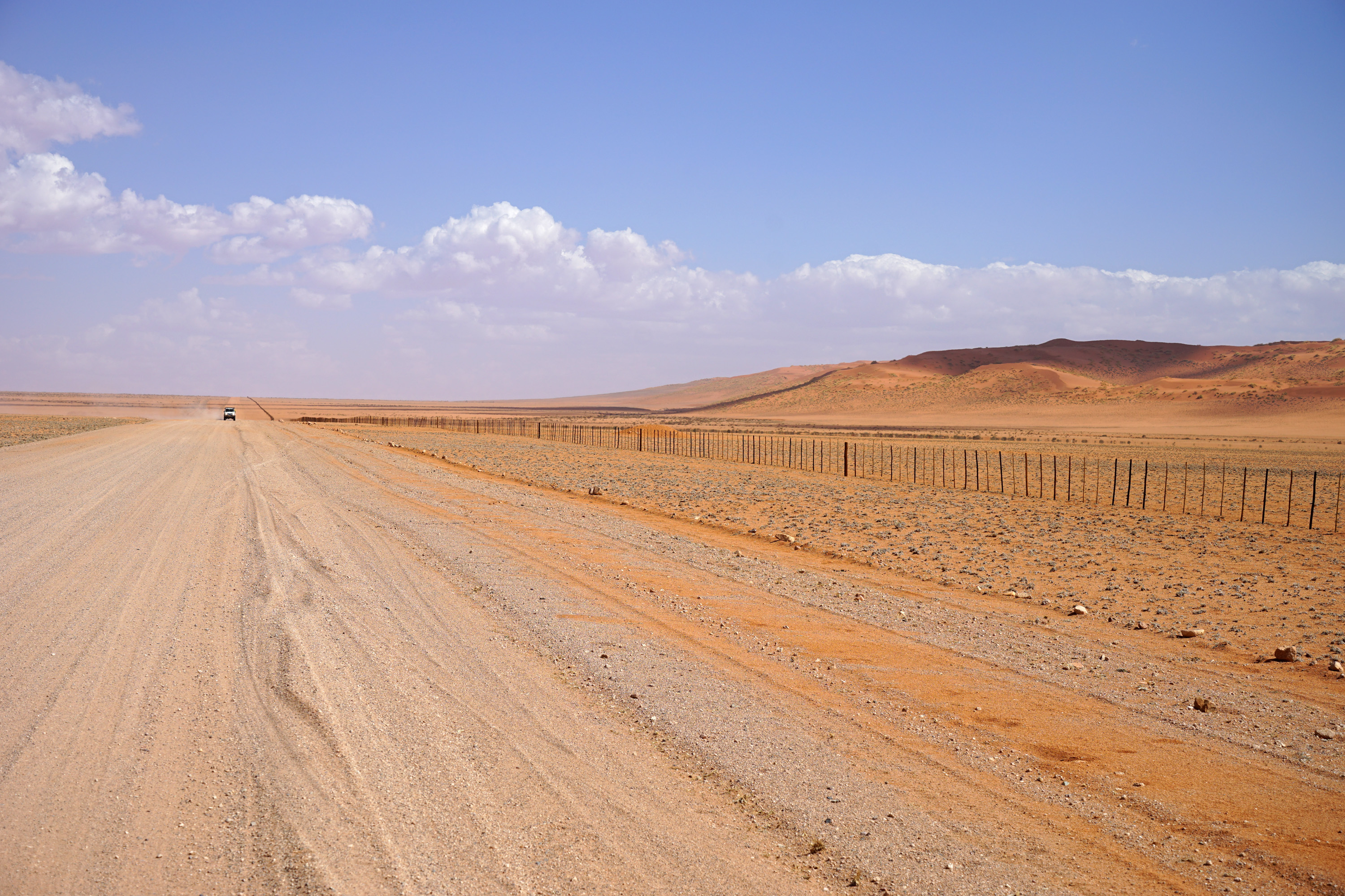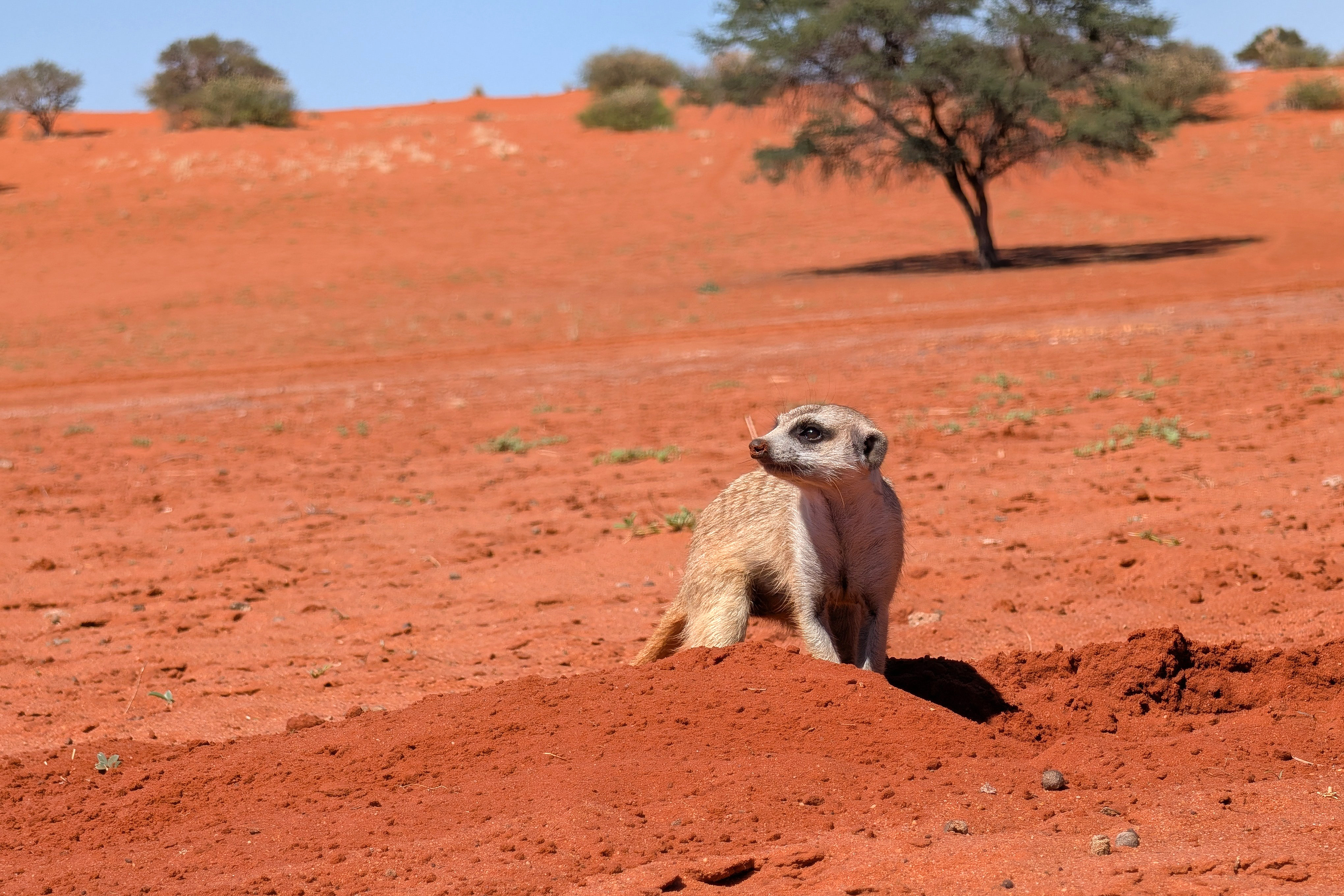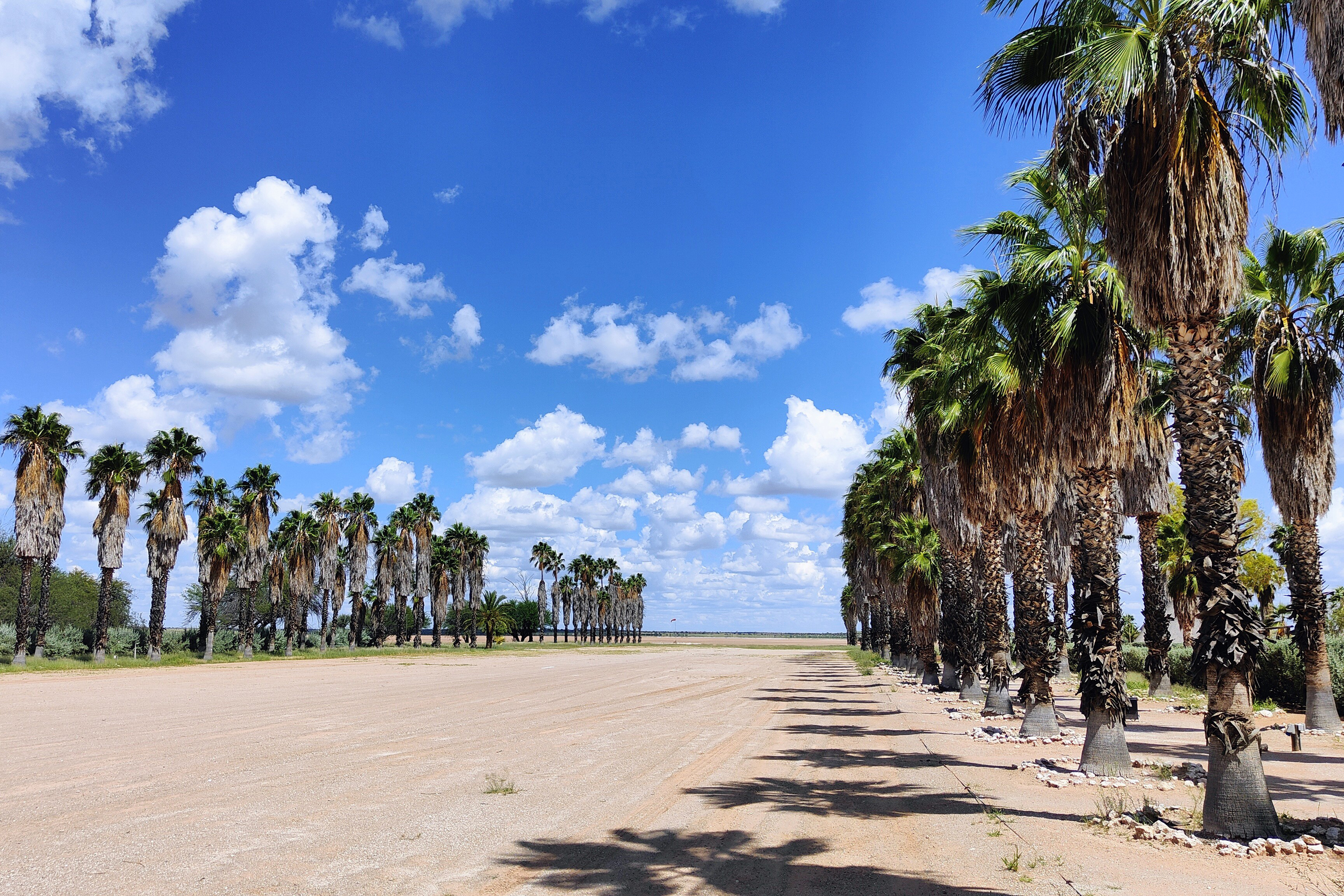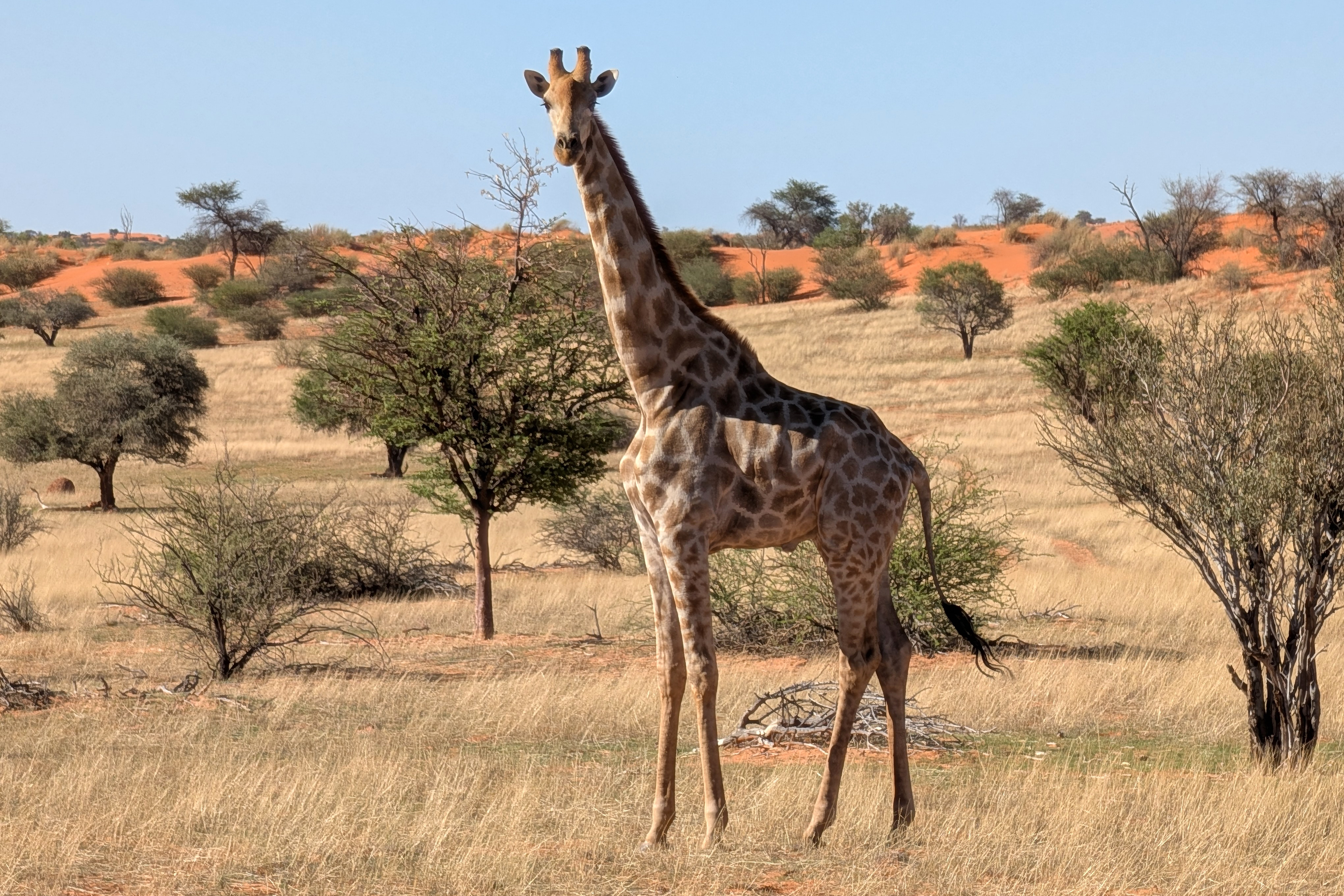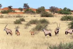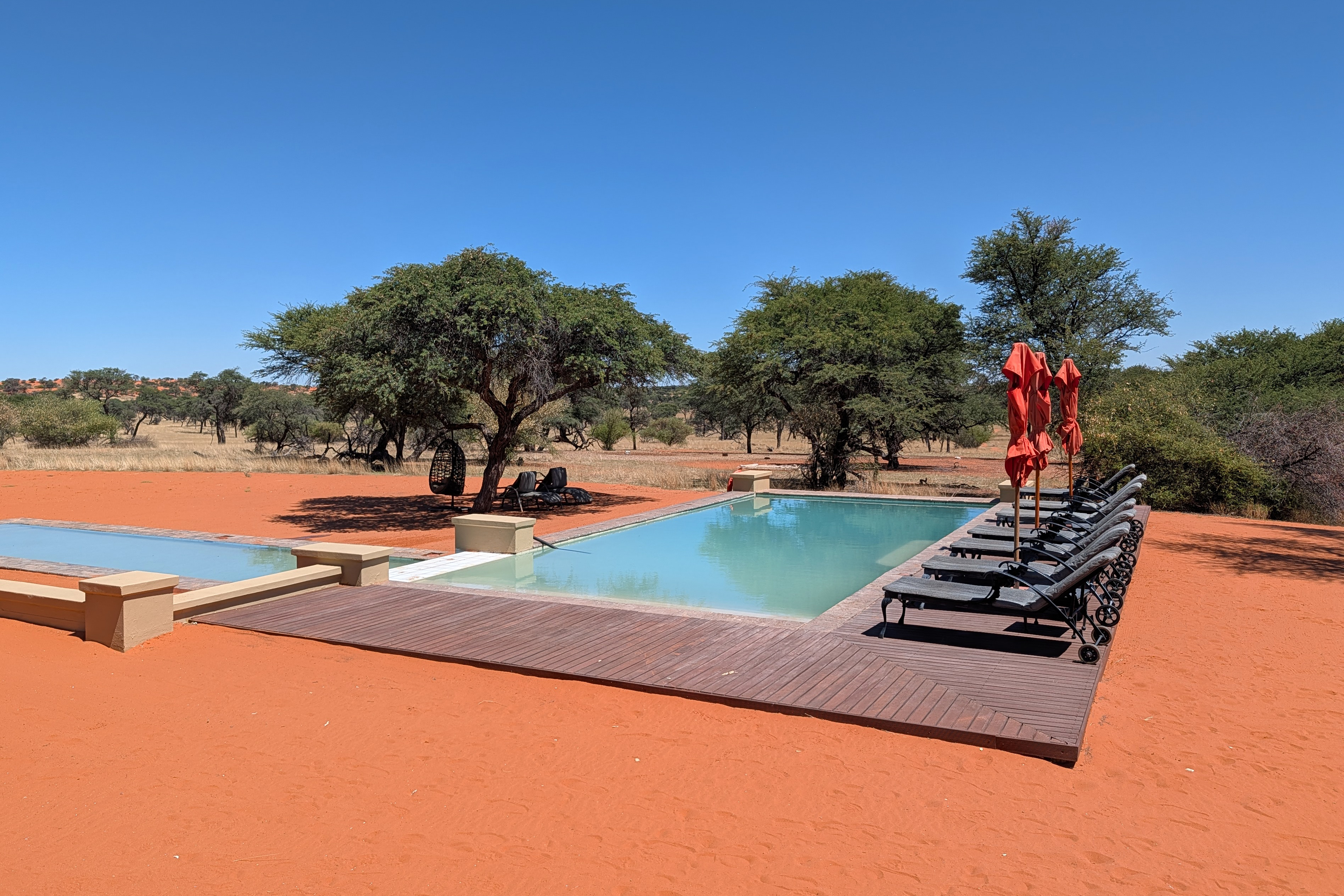 Today, the Grand-Tour begins with a trip to the south. We are heading for the red dunes of the Kalahari. The typical longitudinal dunes or linear dunes of the Kalahari are usually strongly overgrown with grasses, shrubs, and trees. This means that the positions of the dunes do not change, which distinguishes them from many of the dunes of the Namib in the west. On our way south, we will not take the asphalt road, but will drive on a route further east on gravel roads via Dordabis and Uhlenhorst. This remote route is much more scenic and offers a few interesting places to visit. Right at the beginning, we pass the Schutztruppenturm, which is a defence tower near Klein Nauas. This defensive tower of the German Schutztruppe was built during colonial times to combat the Rehoboth Baster uprising. On the drive, we will soon discover the first red sand dunes. Behind Uhlenhorst lies a place that is world-famous in gliding circles: more than 40 world records in gliding have been set at the Bitterwasser Farm because the thermal conditions there are so excellent. For particularly long flights – over 500 km, for example – a palm tree is planted in honor of the pilots. Over the years, this has resulted in an avenue of palm trees leading to the launch site. The launch site consists of a huge white clay pan, typical of the Kalahari, which is often flooded during the rainy season. The soil of the pan is highly alkaline, giving the water a bitter taste. The airfield is therefore not used during the rainy season from February onwards. From Bitterwasser, it is not far, and we drive directly through the longitudinal dunes to our accommodation, the Zebra Kalahari Lodge. The lodge is beautifully situated between the dunes. It offers air-conditioned rooms, a veranda overlooking the waterhole, and a beautiful pool. In the late afternoon, you can enjoy a game drive or go on a short Bushman walk. In the evening, various residents of the Kalahari can be seen at the waterhole. With a little luck, you will see giraffes, springboks, wildebeests, oryx or zebras.