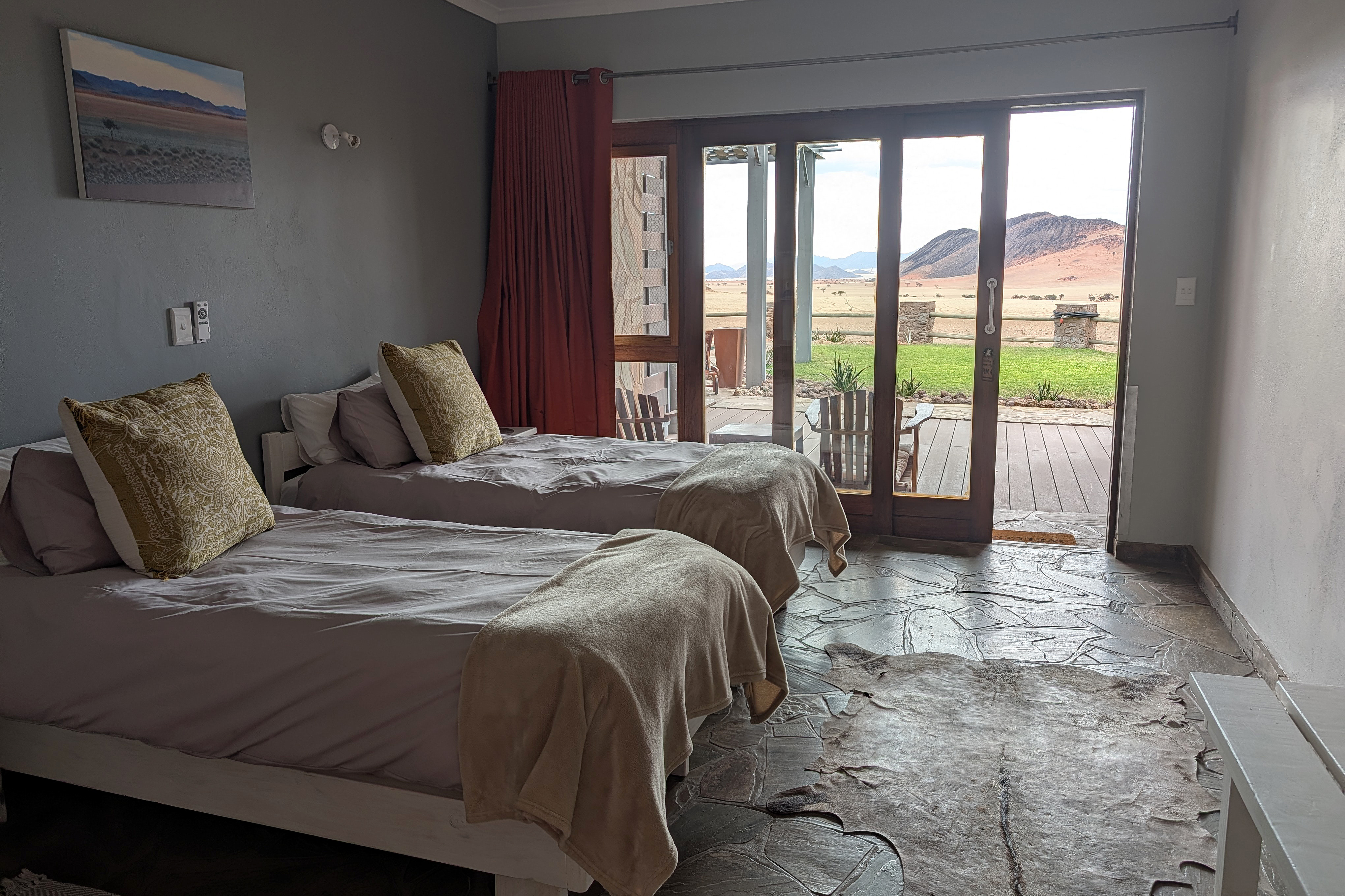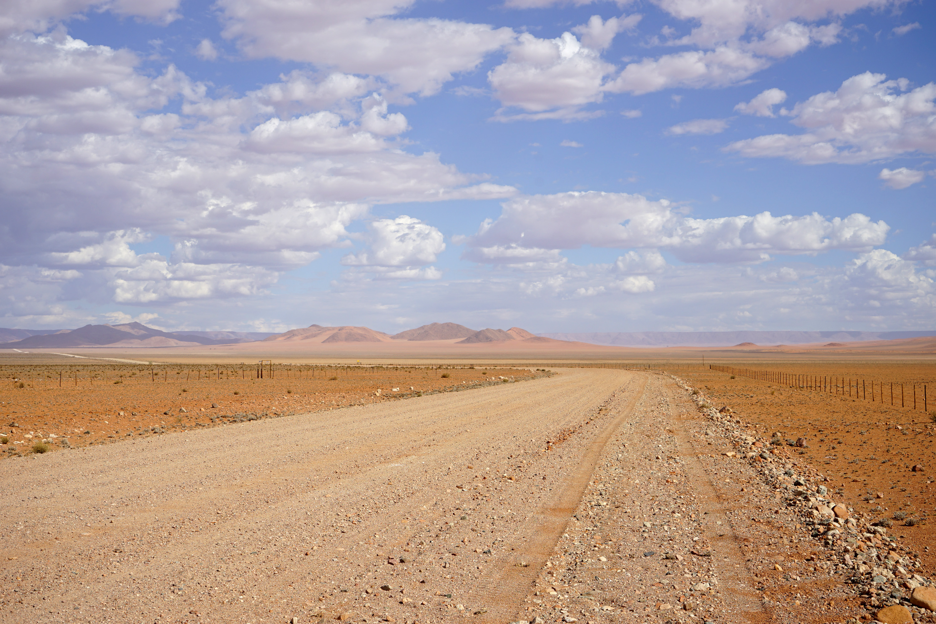 On the ninth day of the Grand-South-North-Tour, you will once again experience the vastness of the south. If you want to use the morning hours for a hike in the mountains, there is plenty of time for that. The granite rocks with their vantage points allow for far-reaching views of the deserted landscape. The view to the west towards Garub is particularly stunning. Afterwards, we will drive to Greenfire Desert Lodge, where we will spend the night. It will be our last night in southern Namibia, so enjoy the endless expanse of the region once again on this day. First, we will drive along the C13 gravel road, where you can see the foothills of the Rooirand Mountains on your right. These look like table mountains and are flat and smooth like a tablecloth. Right next to the road, you can also see many termite mounds. This road continues to Helmeringhausen, but we turn left at the Tiras Mountains. From now on, we are on what is probably the most beautiful road in Namibia – the D707. Everyone, whether tourist or local, raves about this gravel road because it leads in absolute solitude along the red sand dunes of the Namib. From some points on the track, you can see 20 or even 30 kilometers to the other end of the road. The D707 is undoubtedly a highlight of the great south-north tour. We then arrive in Betta, a tiny place on the way to Greenfire Lodge. Betta is a little like the better-known Solitaire further north, as Betta also consists mainly of a gas station, old vintage cars, and a shop with a café serving delicious cakes. In a desert country like Namibia, places like this are like little oases, as you can buy cold drinks, ice cream, or simply refill your water bottles. After leaving Betta, it takes less than an hour to reach Greenfire Desert Lodge. This lodge is located on the Excelsior Farm, which offers untouched desert nature in abundance. Here you will find red sand dunes, black cone-shaped mountains, and sunsets that are second to none. Greenfire is therefore the ideal place to relax and say goodbye to southern Namibia. In the late afternoon, we will take a scenic drive in an open off-road vehicle, which will take us to the most beautiful spots. Afterwards, dinner will be served at the lodge.