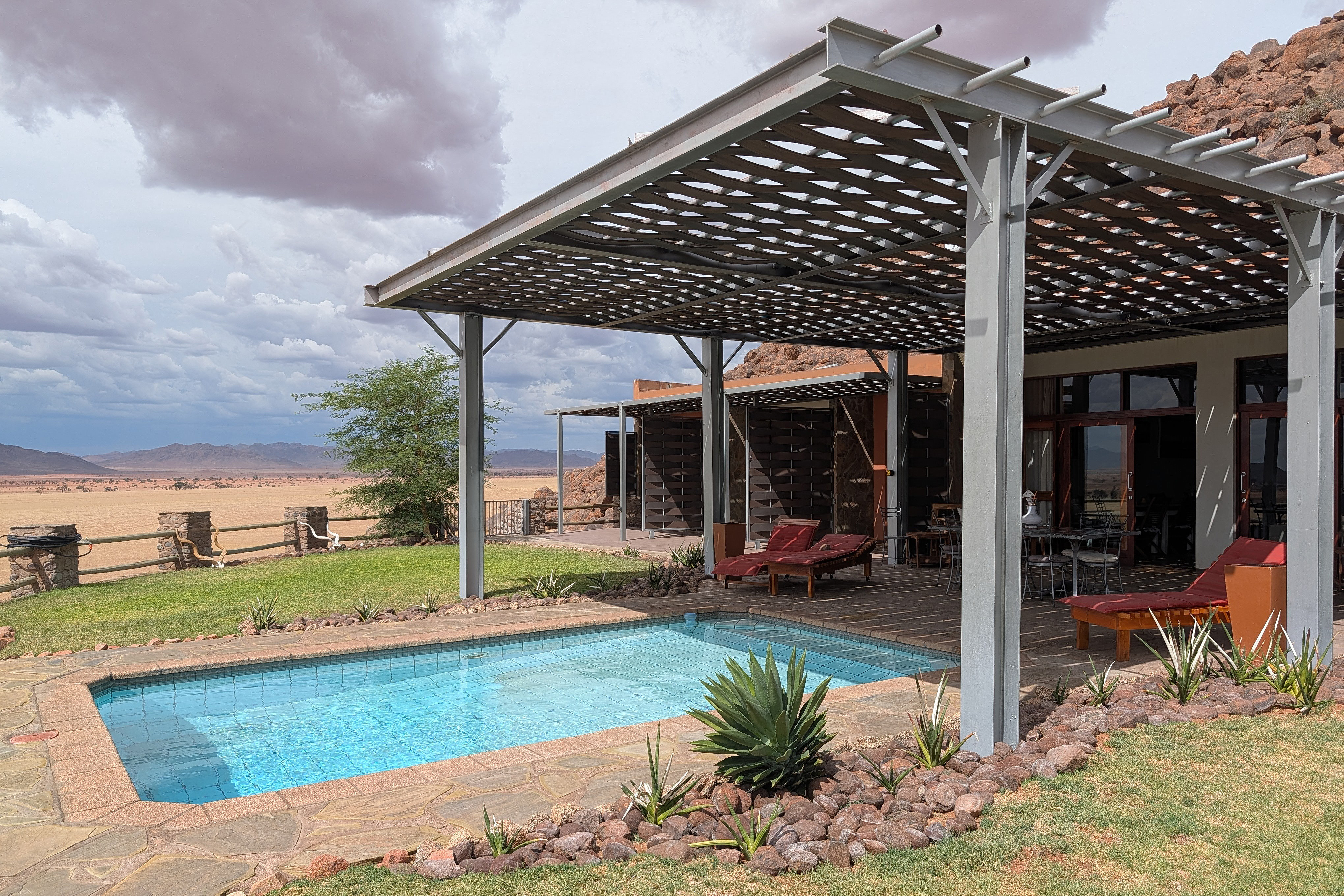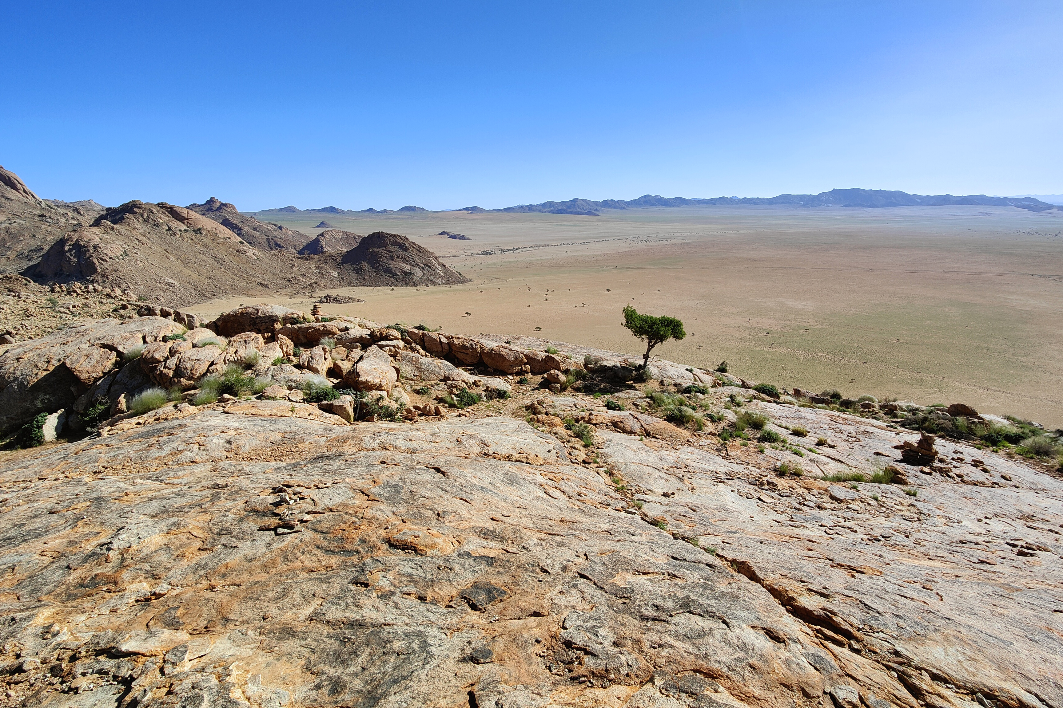In the morning, you will get to know all the beauty of Damaraland and the region around Twyfelfontein on a four-hour drive in an open offroad vehicle. After breakfast we will explore the surroundings in the best photo light and look again for desert-adapted elephants. Very likely, we will find elephants in the Huab River bed this morning. Other wild animals such as ostriches and giraffes can also be observed in the Huab. After our safari into the bush we can drive to the blackish Burnt Mountain and the Organ Pipes at Twyfelfontein. The Organ Pipes made of dolorite, a form of basalt, are of volcanic origin and were created by cooling down molten material. They form polygonal stone columns that look like organ pipes. If you wish, we can also visit the Twyfelfontein rock engravings, of which there are more than 2500 pieces and which can be several thousand years old. There is also the opportunity to visit the Living Museum of the Damara. Here you can get to know the culture of the Damara people. This sortiment of activities is merely an offer - you can decide which you prefer. Then we drive north to the Grootberg Lodge. Here you will get to know a new type of landscape of the Damaraland – instead of granite outcrops, from now on large table mountains with a flat plateau dominate the surroundings. The barren but beautiful landscape is dotted with a carpet of stones everywhere, which is only loosened up by dry river courses or by individual Euphorbia bushes, Mopane trees or other shrubs. We will probably see some wildlife along the way on our trip through the Torra Conservancy, as almost all mammals – from lions to rhinos – are native to this communal area. Even wild leopards can be found with great luck right next to the road. The attraction of the Damaraland is probably exactly this: You are outside a national park in an area where humans with their sheep and goats are at home and yet you can see all kinds of free-roaming animals in the wild. In the afternoon we will reach the lodge on the Grootberg from where you have a wonderful view over the wide valley.