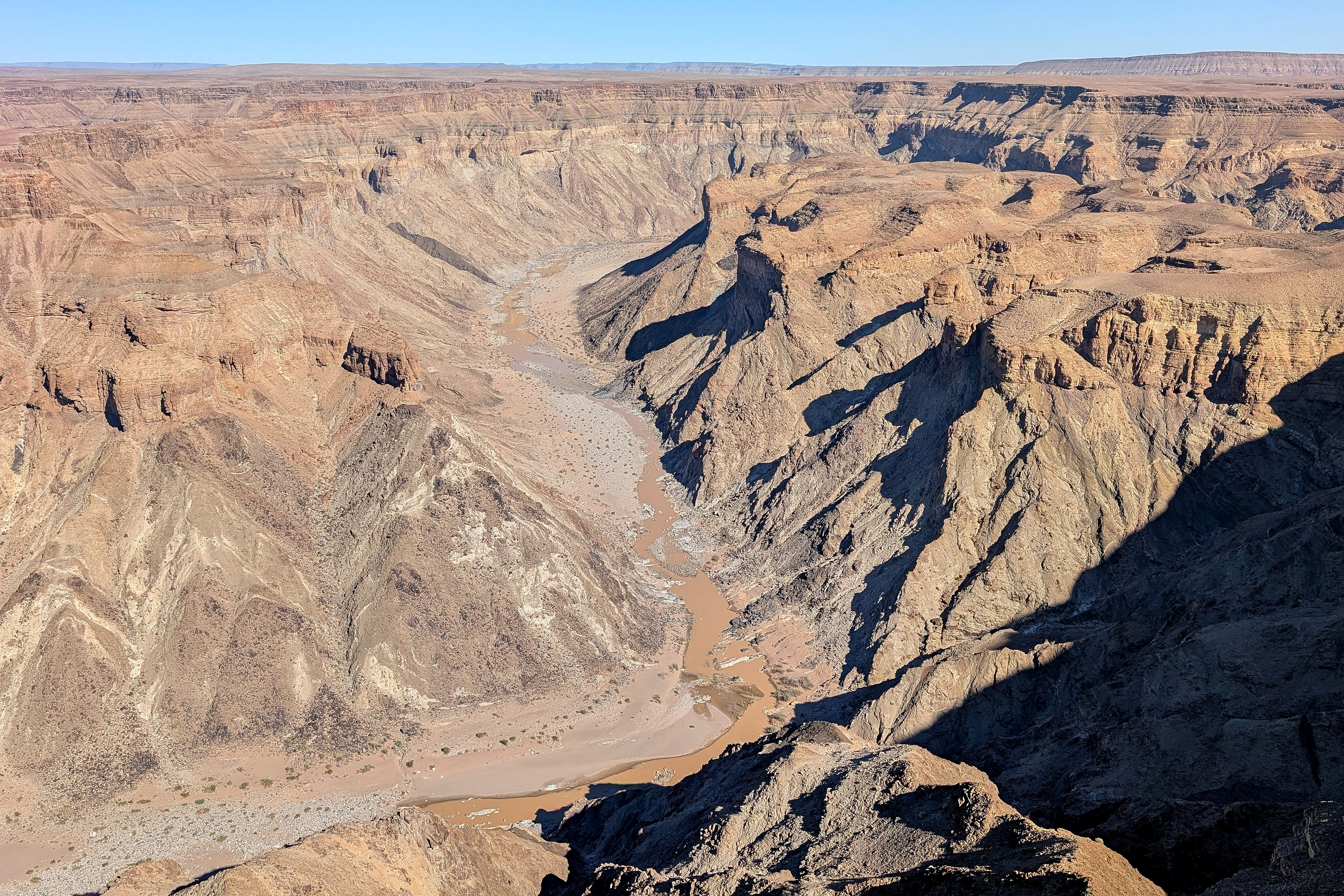 On the fourth day of the tour, you will have plenty of time to enjoy the unique landscape. In the morning, we will drive to the Fish River Canyon viewpoint. There, you can look down into the canyon, which is up to 550 meters deep. The dimensions of the gorge are enormous. With a width of up to 27 kilometers and a length of 160 kilometers, the Fish River Canyon is the second largest canyon in the world. Only the Grand Canyon in the USA is larger. The canyon began to develop 300 million years ago and was given a boost by the tectonic break-up of the Gondwana continent 120 million years ago. It begins at Seeheim in the north and ends at Ai-Ais in the south. The Fish River, which created it, is Namibia's longest river at 650 kilometers. It flows into the Orange River south of Ai-Ais, and this border river with South Africa flows into the Atlantic Ocean. Hiking is also permitted in the Fish River Canyon, but only from May to September, as it otherwise becomes too hot in the gorge and floods could take hikers by surprise. We will take plenty of time to explore the canyon this morning. On a three-hour round trip along the edge of the escarpment, we will follow the course of the river southwards. Along the way, we will come across new viewpoints every few kilometers. Here you can see how beautifully the river meanders through the landscape in deep gorges. On the tour, you will also see typical shrubs of Euphorbia gregaria, which is poisonous and belongs to the spurge family. After our tour of the canyon, we will return to the lodge. Now you have the whole afternoon to relax by the pool or somewhere in the shade. The Canyon Lodge is a true green oasis in the middle of the barren dry landscape. Here you can also sit back and relax in the lodge's own beer garden. Beer on tap tastes particularly delicious in the warm south of Namibia. An outdoor dinner on the veranda will round off the day perfectly.