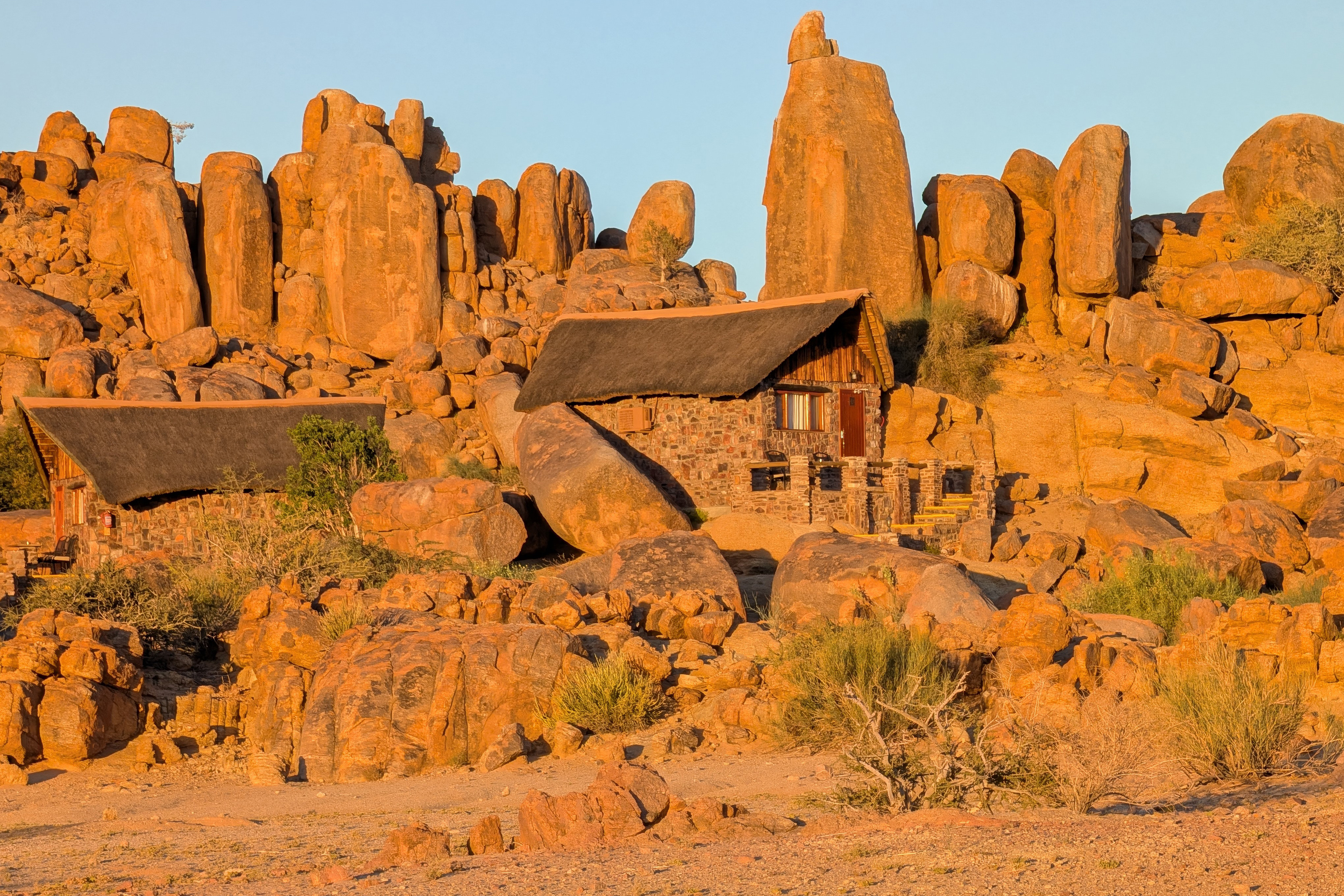 If there are desert elephants in the vicinity of the lodge, we can go on a game drive in an open safari truck after breakfast. Here you can get to know the elephants up close. Desert-adapted elephants are not a subspecies of their own, but compared to savanna elephants they have physical adaptations, which make it easier for them to survive in the dryland areas. Their feet are a little wider, so that they can walk better through deep sand. Desert-adapted elephants often have to travel very long distances of up to 70 km to get from one dry river bed to the next. This is because the dry rivers with their dense, year-round green trees and bushes are the main source of food for elephants in the northwest of Namibia. If the elephants are not there, we can take a hike to visit the rock carvings of the Brandberg, such as the “White Lady”. We then leave the Brandberg and cross the Ugab River. From the Ugab towards the north, you can now see more and more of the wild animals typical of the Damaraland such as zebras, springboks, giraffes, kudus and, with exceptionally good luck, even a black rhinoceros. This is because in the Damaraland north of the Ugab, the huge area begins, where the local nature conservation project IRDNC has been working so successfully in the last decades. It was also here in the Damaraland that the establishment of the Save The Rhino Trust (SRT) in the early 1980s was a major contribution to protecting the black rhinoceros. An important SRT field station is still operating at the Ugab on the west side of the Brandberg, from where regular patrols are carried out to protect the rhinos. In the late afternoon we will arrive in the Twyfelfontein area, which is characterized by its bizarre landscape of many small granite outcrops. You will spend the night in the very comfortable Twyfelfontein Country Lodge. The lodge is beautifully integrated into the mountain landscape of Twyfelfontein and offers the best relaxation.